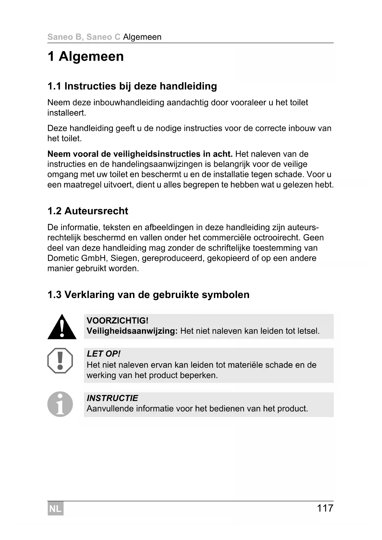 Dometic producten voldoen aan de gespecificeerde eigenschappen conform de desbetreffende Europese richtlijnen. De actuele conformiteitsverklaring kunt u bij Dometic GmbH, Siegen, direct aanvragen.NL Veiligheidsinstructies Saneo B, Saneo C