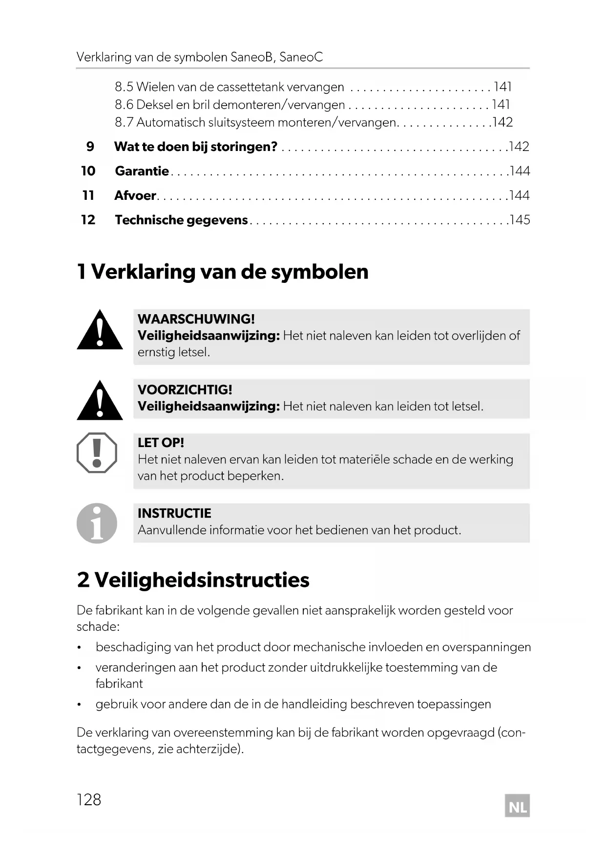 gebruik voor andere dan de in de handleiding beschreven toepassingen De verklaring van overeenstemming kan bij de fabrikant worden opgevraagd (con- tactgegevens, zie achterzijde). WAARSCHUWING! Veiligheidsaanwijzing: Het niet naleven kan leiden tot overlijden of ernstig letsel. VOORZICHTIG! Veiligheidsaanwijzing: Het niet naleven kan leiden tot letsel. LET OP! Het niet naleven ervan kan leiden tot materiële schade en de werking van het product beperken. INSTRUCTIE Aanvullende informatie voor het bedienen van het product. Saneo-B-Saneo-C--O-18s.book Seite 128 Mittwoch, 7. März 2018 9:33 09NL SaneoB, SaneoC Veiligheidsinstructies
