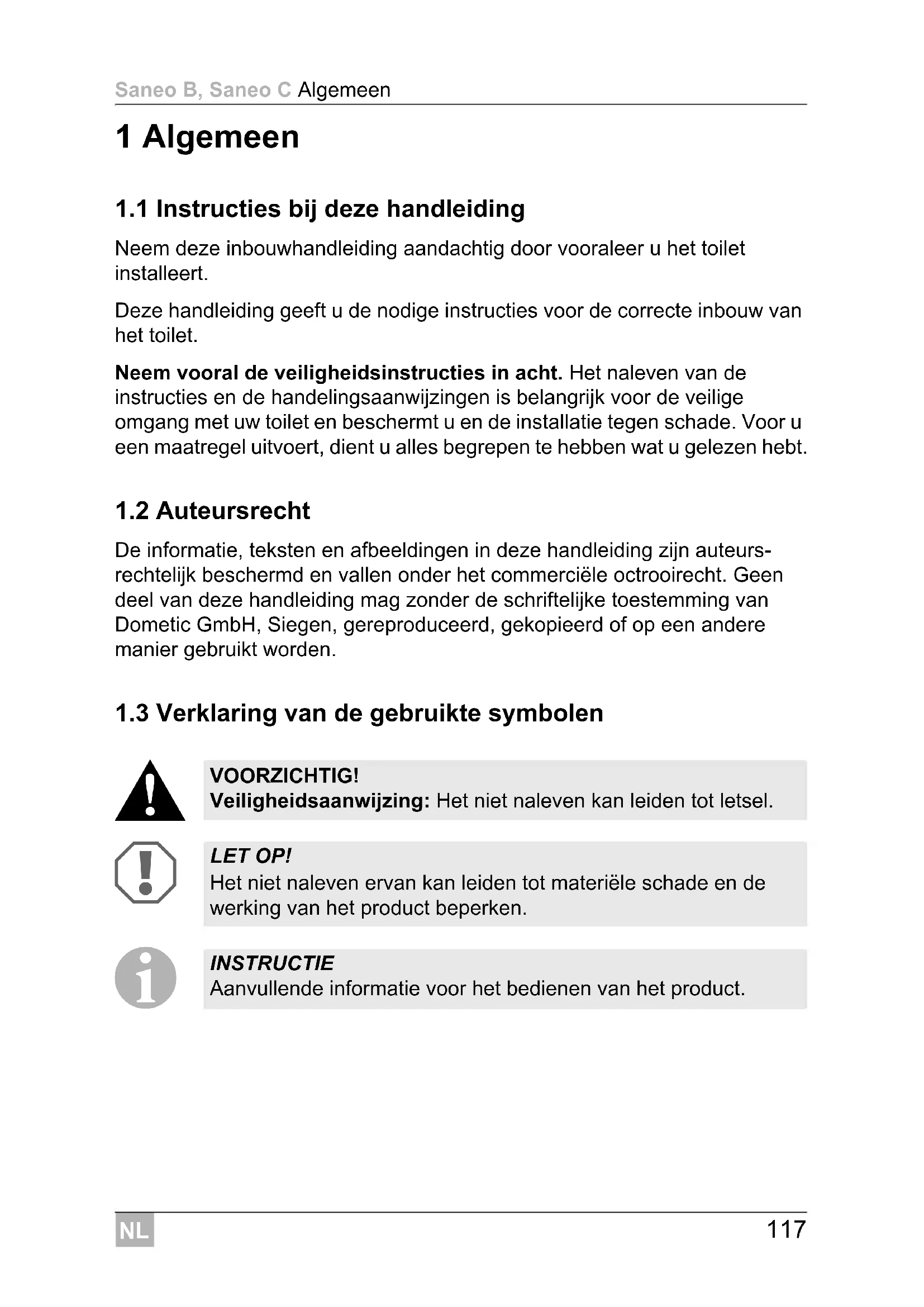 VOORZICHTIG! Veiligheidsaanwijzing: Het niet naleven kan leiden tot letsel. LET OP! Het niet naleven ervan kan leiden tot materiële schade en de werking van het product beperken. INSTRUCTIE Aanvullende informatie voor het bedienen van het product.NL Algemeen Saneo B, Saneo C
