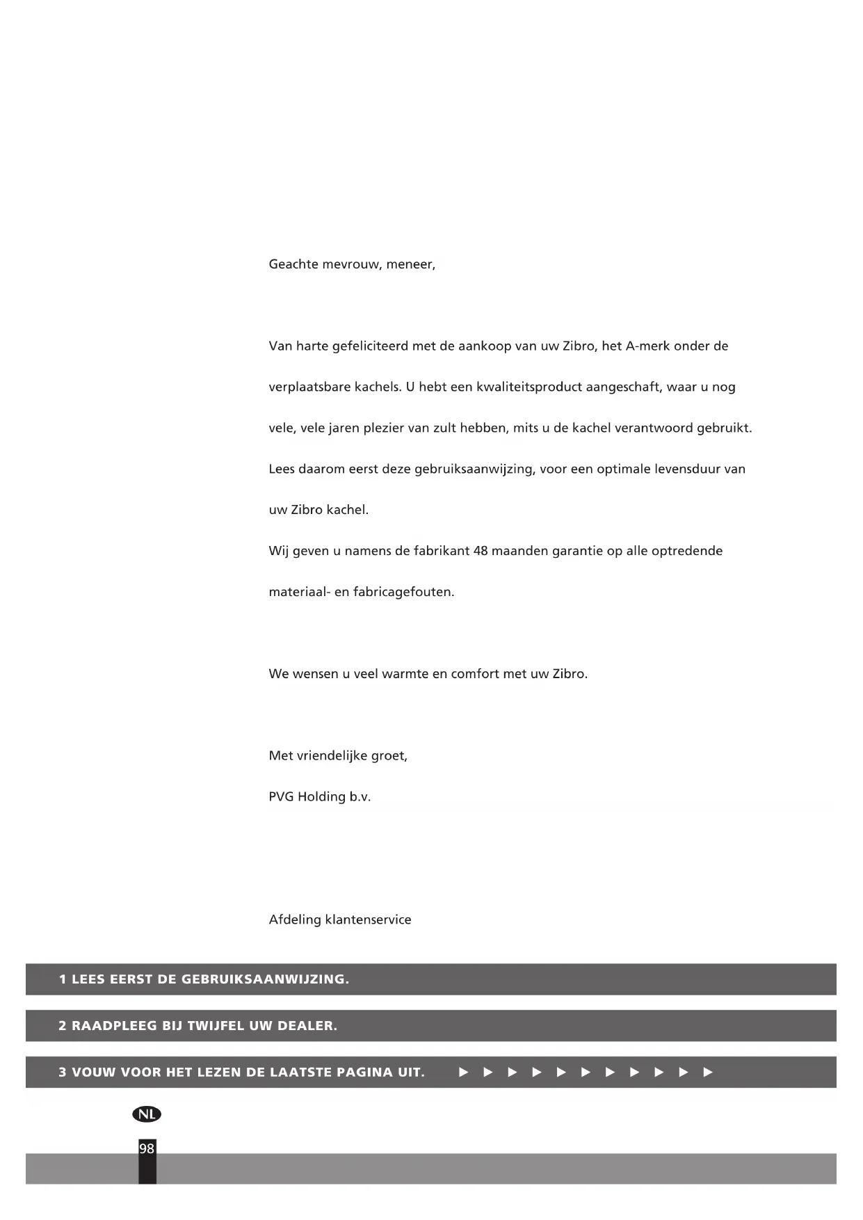 Sett den fylte uttakbare beholderen på plass. Sett bat- teriene i batteriholderen (påse at positive og negative poler stemmer med merkene + og - på batterihuset). Vent i 30 minutter etter at beholderen og batteriene er satt på plass før varmeovnen tas i bruk. 100 cm 150 cm 50 cm 50 cm 20 cm 50 cm p86_97_no_R224TC.indd 97 03-06-13 13:40Geachte mevrouw, meneer, Van harte gefeliciteerd met de aankoop van uw Zibro, het A-merk onder de verplaatsbare kachels. U hebt een kwaliteitsproduct aangeschaft, waar u nog vele, vele jaren plezier van zult hebben, mits u de kachel verantwoord gebruikt. Lees daarom eerst deze gebruiksaanwijzing, voor een optimale levensduur van uw Zibro kachel. Wij geven u namens de fabrikant 48 maanden garantie op alle optredende materiaal- en fabricagefouten. We wensen u veel warmte en comfort met uw Zibro. Met vriendelijke groet, PVG Holding b.v. Afdeling klantenservice 1 Lees eerst de gebruiksaanwijzing. 2 raadpLeeg bij twijfeL uw deaLer. 3 Vouw Voor het Lezen de Laatste pagina uit. e e e e e e e e e e e