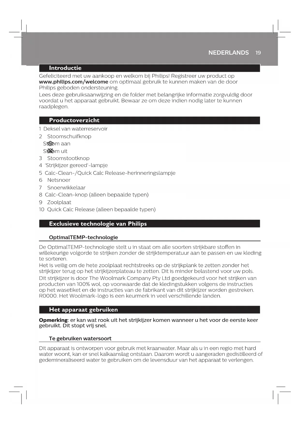 Problemen oplossen Dit hoofdstuk behandelt in het kort de problemen die u kunt tegenkomen tijdens het gebruik van het apparaat. Als u het probleem niet kunt oplossen met de informatie hieronder, ga dan naar www.philips.com/support voor een lijst met veelgestelde vragen of neem contact op met het Consumer Care Centre in uw land. Probleem Mogelijke oorzaak Oplossing Het strijkijzer kan kreukels niet uit een kledingstuk verwijderen. Er komt geen stoom uit het strijkijzer tijdens het strijken. Vul het waterreservoir en zet de stoomschuifknop in de stand . Het strijkijzer produceert geen stoom. Er zit niet voldoende water in de tank. Vul het waterreservoir. De stoomschuifknop is ingesteld op . Zet de stoomschuifknop in de stand . Het strijkijzer is niet warm genoeg om stoom te produceren. Wacht tot het 'strijkijzer gereed'-lampje niet meer pulseert, maar continu brandt. Er vallen druppeltjes water op de kleding tijdens het strijken. U hebt de stoomstootfunctie te vaak achter elkaar gebruikt. Ga verder met strijken, met het apparaat in horizontale stand, en wacht een tijdje voordat u de stoomstootfunctie opnieuw gebruikt. U hebt het deksel van het waterreservoir niet goed gesloten. Druk op het klepje tot u een 'klik' hoort. U hebt de opvangbank van de Quick Calc Release niet goed terug in het apparaat geplaatst (alleen bepaalde typen). Stop met strijken en laat het strijkijzer ten minste 1 uur afkoelen. Trek de Quick Calc Release-opvangbak uit het apparaat. Plaats het terug in het apparaat en zorg ervoor dat de opvangbak in lijn is met het oppervlak van het apparaat. Duw de hendel omlaag ("klik"). Als de Quick Calc Release-opvangbak is beschadigd, neem dan contact op met een Consumer Care Centre in uw land (zie het 'worldwide guarantee'-vouwblad voor contactgegevens). Het strijkijzer produceert geen stoomstoot. U hebt de stoomstootfunctie te vaak achter elkaar gebruikt. Ga verder met strijken, met het apparaat in horizontale stand, en wacht een tijdje voordat u de stoomstootfunctie opnieuw gebruikt. Het strijkijzer is nog niet warm genoeg om te strijken. Wacht tot het 'strijkijzer gereed'-lampje niet meer pulseert, maar continu brandt. U hebt een chemische stof in het waterreservoir gedaan. Spoel het waterreservoir schoon en doe geen reukstoen of andere chemicaliën in het waterreservoir. Er komen vuil water en verontreinigingen uit de zoolplaat tijdens het strijken. Hard water met onzuiverheden of chemische stoen heeft schilfers gevormd in de zoolplaat. Voer Quick Calc Release (alleen bepaalde typen) of Calc-Clean (alleen bepaalde typen) uit. Zie hoofdstuk 'Schoonmaken en onderhoud'. Er komen waterdruppels uit de zoolplaat nadat de stekker uit het stopcontact is gehaald. Het strijkijzer is in horizontale stand blijven staan terwijl er nog water in het waterreservoir zat. Leeg het waterreservoir na gebruik of berg het strijkijzer in de verticale stand op. De stoomschuifknop is ingesteld op . Zet de stoomschuifknop op . Er knippert een oranje lampje op de handgreep van het strijkijzer. Het Calc-Clean- herinneringslampje is geactiveerd. Dit is om u eraan te herinneren dat u Calc-Clean moet uitvoeren. Voer Quick Calc Release (alleen bepaalde typen) of Calc-Clean (alleen bepaalde typen) uit. Zie hoofdstuk 'Schoonmaken en onderhoud'. Het strijkijzer laat een glans of een afdruk op het kledingstuk na. Het oppervlak dat gestreken moest worden was ongelijk, bijvoorbeeld omdat u over een naad of een vouw in het kledingstuk hebt gestreken. Het strijkijzer is veilig te gebruiken op alle strijkbare kledingstukken. Een glimmende plek of afdruk is niet permanent en verdwijnt als u het kledingstuk wast. Strijk niet over naden of vouwen. U kunt ook een katoenen doek over het te strijken gedeelte leggen om afdrukken te voorkomen.23 DANSK Introduktion Tillykke med dit køb og velkommen til Philips! Hvis du vil have fuldt udbytte af den support, som Philips tilbyder, kan du registrere dit produkt på www.philips.com/welcome. Læs denne brugervejledning og brochuren med vigtige oplysninger omhyggeligt igennem, inden apparatet tages i brug. Gem dem til senere brug. Produktoversigt 1 Låg til vandtank 2 Dampskyder Damp til Damp fra 3 Knap til dampskud 4 Lysindikator for "strygejernet er klar" 5 Lysindikator for påmindelse om Calc-Clean/Hurtig afkalkning 6 Netledning 7 Ledningsoprul 8 Calc-Clean-knap (gælder kun nogle modeller) 9 Strygesål 10 Hurtig afkalkning (gælder kun nogle modeller) Eksklusiv teknologi fra Philips OptimalTEMP-teknologi OptimalTEMP-teknologien gør det muligt at stryge alle strygbare stoer, i vilkårlig rækkefølge, uden at justere strygetemperaturen eller sortere tøjet. Det er sikkert blot at lade den varme strygesål stå direkte på strygebrættet uden at sætte det tilbage i holderen. Herved mindskes belastningen af håndleddet. Strygejernet er blevet godkendt af Woolmark Company Pty Ltd til strygning af uldprodukter, hvis tøjet stryges i overensstemmelse med instruktionerne på tøjets mærkat og instruktionerne fra producenten af dette strygejern. R0000. Woolmark- symbolet er et certiceringsmærke i mange lande. Sådan bruges apparatet Bemærk: Strygejernet kan afgive lidt røg, når det tages i brug første gang. Dette stopper efter kort tid. Type af vand, der skal bruges Der skal kommes vand fra hanen i apparatet. Hvis du bor i et område med hårdt vand, kan der dog hurtigt komme kalkaejringer. Derfor anbefales det at bruge destilleret eller demineraliseret vand for at forlænge apparatets levetid. Brug ikke parfumeret vand, vand fra en tørretumbler, eddike, stivelse, afkalkningsmiddel, strygemiddel, kemisk afkalket vand eller andre kemikalier, da de kan medføre vandstænk, brune pletter eller skader på apparatet.DANSK