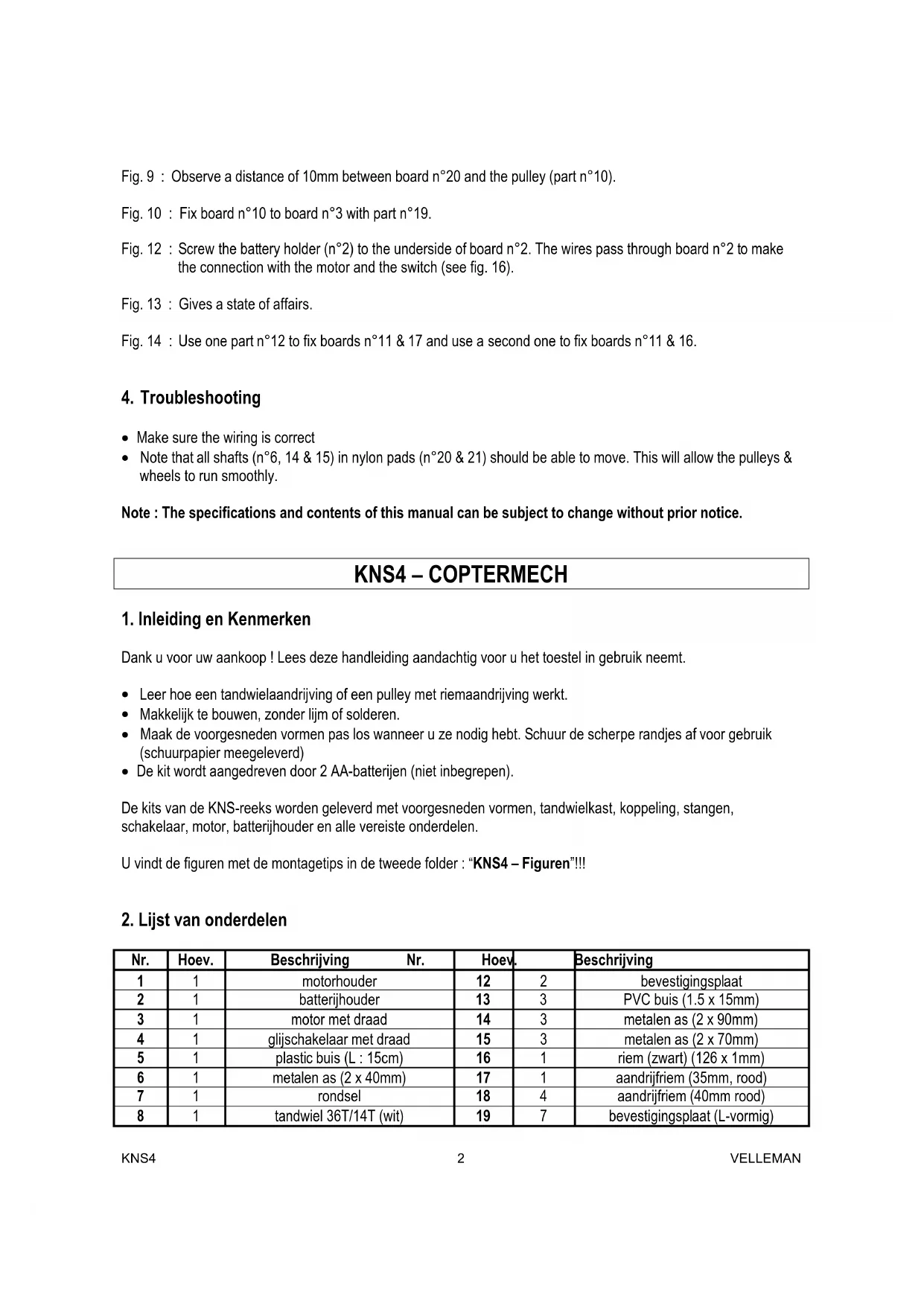 Nr. Hoev. Beschrijving Nr. Hoev. Beschrijving 1 1 motorhouder 12 2 bevestigingsplaat 2 1 batterijhouder 13 3 PVC buis (1.5 x 15mm) 3 1 motor met draad 14 3 metalen as (2 x 90mm) 4 1 glijschakelaar met draad 15 3 metalen as (2 x 70mm) 5 1 plastic buis (L : 15cm) 16 1 riem (zwart) (126 x 1mm) 6 1 metalen as (2 x 40mm) 17 1 aandrijfriem (35mm, rood) 7 1 rondsel 18 4 aandrijfriem (40mm rood) 8 1 tandwiel 36T/14T (wit) 19 7 bevestigingsplaat (L-vormig)KNS4 VELLEMAN 3 9 2 katrol 19.5 x 2mm (blauw) 20 15 nylon kraagring 10 8 katrol 15 x 2mm (geel) 21 11 nylon kraagring 11 2 katrol 24 x 2mm (wit) 22 26 zelftappende schroef