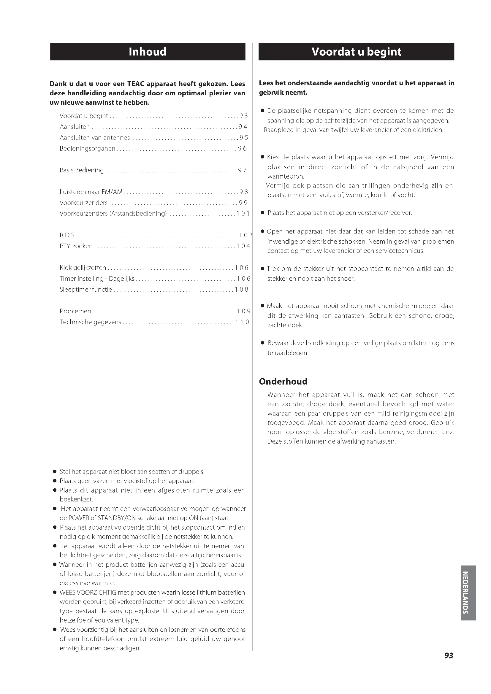 SL:90 (80, 70, 60, 50, 40, 30, 20 of 10) De T-R650 schakelt na 90 (80, 70, 60, 50, 40, 30, 20 of 10) minuten automatisch uit. Normaal display De sleeptimer staat uit. < Als u de resterende tijd wilt controleren drukt u een keer op de SLEEP-toets. De resterende tijd verschijnt 2,5 seconde in het display waarna het display naar de normale stand terug gaat.109 NEDERLANDS Controleer de volgende punten indien u een probleem met het apparaat heeft en kijk of u het probleem zelf kunt oplossen alvorens uw leverancier of de servicedienst van TEAC te waarschuwen. Geen netspanning e Controleer het stopcontact waarop u het apparaat heeft aangesloten spanning voert en of het mogelijk uitgeschakeld is.-Controleer met een lamp, een ventilator of dergelijke of er spanning op het stopcontact staat. Geen geluid e Controleer de verbinding met de versterker. e Controleer de instellingen/van de versterker. Geen ontvangst of het signaal is te zwak. e Controleer of de antenne(s) correct zijn aangesloten. e Stem de zender correct af. e Installeer de antenne opnieuw nadat u mogelijk een plaats met een betere ontvangst heeft gevonden. e Mogelijk is het aansluiten van een externe antenne noodzakelijk. Het geluid vervormt/ruist. e Houd de antenne zover mogelijk uit de buurt van een TV of CD-speler. e Schakel een eventueel in de buurt staande TV of CD speler uit. De ontvangst is stereo, het geluid is mono. e Druk op FM MODE. Als normale bediening niet meer mogelijk is trek dan de stekker uit het stopcontact en steek hem vervolgens na 20 seconden weer terug in het stopcontact. Problemen Apparaat terugzetten in de fabrieksinstellingen Indien het apparaat onjuist functioneert, kan het terugzetten in de fabrieksinstellingen het probleem mogelijk oplossen. Alle door u gemaakte instellingen (voorkeurzenders, etc.) worden hierdoor echter gewist. Houd TIMER en BAND tegelijk een paar seconden ingedrukt. De T-R650 wordt nu teruggezet in de fabrieksinstelling.110 Technische gegevens FM-tuner Afstembereik ...........87,50 - 108,00 MHz (stappen van 50 kHz) Bruikbare gevoeligheid ....................................6 dBμ Harmonische vervorming ..........................0,8 % (mono) 1,2 % (stereo) Signaal-/ruisverhouding ...........................70 dB (Mono) 65 dB (Stereo) Stereo kanaalscheiding .............................35 dB (1 kHz) Voorkeurzenders ..............................................30 AM-tuner Afstembereik ................522 - 1.629 kHz (stappen van 9 kHz) Bruikbare gevoeligheid ...................................55 dBμ Harmonische vervorming ......................1,5 % (bij 74 dBμ) Signaal-/ruisverhouding .......................45 dB (bij 80 dBμ) Voorkeurzenders ..............................................30 Algemeen Lichtnetvoeding ....................230 V, 50 Hz wisselspanning Opgenomen vermogen ....................9 W (Standby 0,5 W) Afmetingen (B x H x D) . . . . . . . . . . . . . . . . . . . . . . . 435 x 85 x 295 mm Gewicht ..................................................3,2 kg Bedrijfstemperatuur ................................+5˚C - +35˚C Vochtigheid .................. 5% - 85% (geen condensvorming) Opslagtemperatuur ...............................–20˚C - +55˚C Accessoires AM-ringantenne x 1 FM-draadantenne x 1 Systeembedieningssnoer x 1 Stereo cinch-kabel x 1 Handleiding (dit document) x 1 Garantiekaart x 1 < Ontwerp en technische gegevens zijn zonder voorafgaande kennisgeving wijzigbaar. < Het gewicht en afmetingen zijn bij benadering. < De afbeeldingen verschillen mogelijk iets van de werkelijke apparaten. Informatie voor Gebruikers Over het Verzamelen en Verwerken van Oude Apparatuur en Gebruikte Batterijen Deze symbolen op de producten, de verpakking en/of bijbehorende documenten, betekenen dat gebruikte elektrische en elektronische producten en batterijen niet met het huisvuil mogen worden weggegooid. Voor een juiste behandeling, verwerking en recycling van oude producten en gebruikte batterijen kunt u terecht bij de daarvoor aangewezen depots in overeenstemming met de plaatselijke wetgeving en de richtlijnen 2002/96/EU en 2006/66/EU. Door deze producten en de batterijen correct te behandelen, helpt u waardevolle materialen te behouden en eventuele negatieve effecten op de gezondheid en het milieu ten gevolge van onverantwoorde behandeling te voorkomen. Nadere informatie over het verzamelen en recyclen van oude producten en batterijen kan de plaatselijke milieudienst u geven en anders de leverancier van het product. Informatie over het Afvoeren in Landen Buiten de Europese Unie Deze symbolen gelden alleen voor de Europese Unie en wanneer u deze producten wilt afvoeren, neem dan contact op met de plaatselijke autoriteiten of uw leverancier voor de juiste wijze van afvoeren. Opmerking over het batterij symbool (hieronder rechts twee voorbeelden): Dit symbool kan worden gebruikt in combinatie met een chemisch symbool. In dat geval voldoet het aan de eisen als gesteld in de richtlijn voor desbetreffende chemicaliën. Voor Europese Klanten111Z