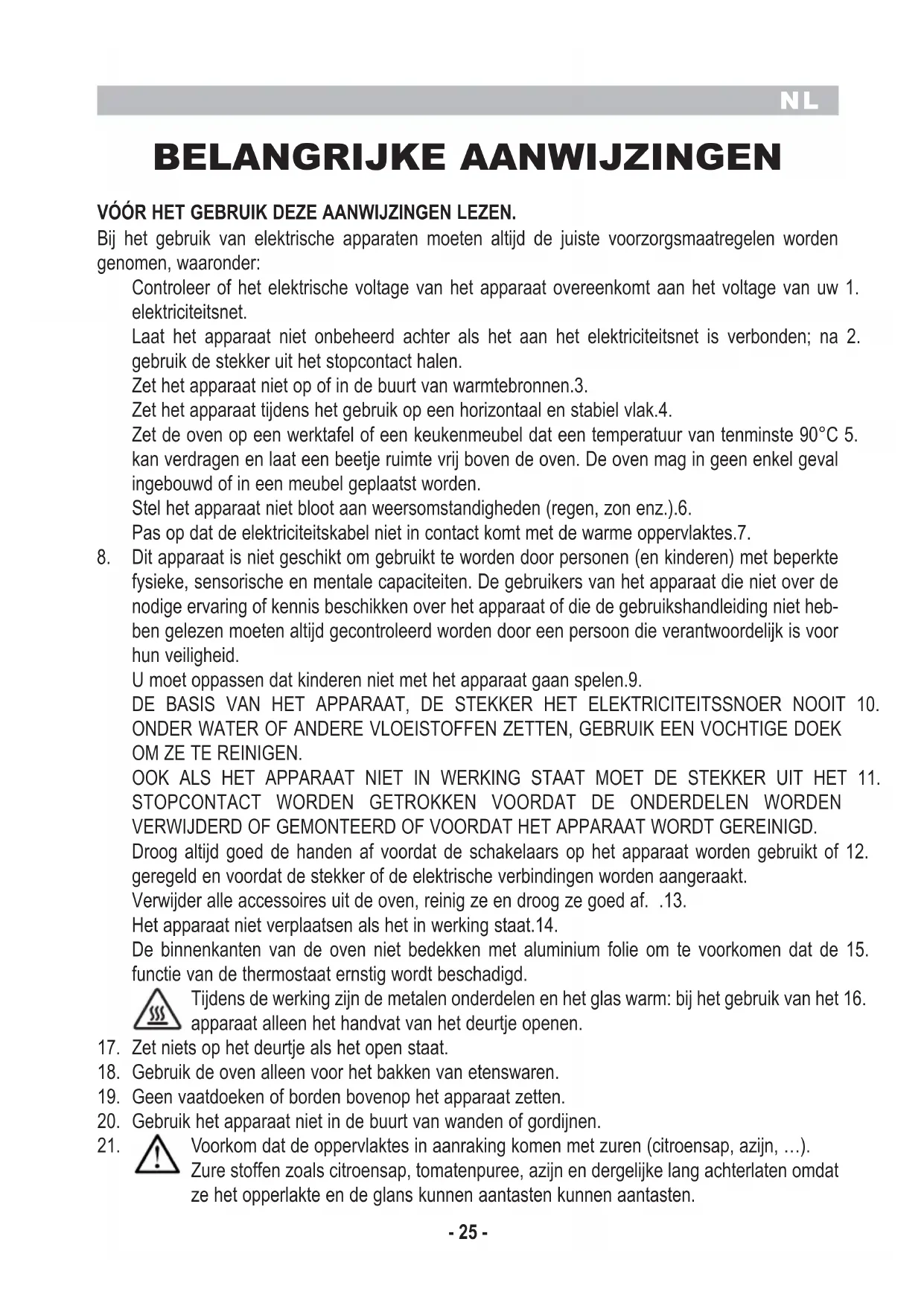 BELANGRIJKE AANWIJZINGEN VÓÓR HET GEBRUIK DEZE AANWIJZINGEN LEZEN. Bij het gebruik van elektrische apparaten moeten altijd de juiste voorzorgsmaatregelen worden genomen, waaronder: Controleer of het elektrische voltage van het apparaat overeenkomt aan het voltage van uw 1. elektriciteitsnet. Laat het apparaat niet onbeheerd achter als het aan het elektriciteitsnet is verbonden; na 2. gebruik de stekker uit het stopcontact halen. Zet het apparaat niet op of in de buurt van warmtebronnen.3. Zet het apparaat tijdens het gebruik op een horizontaal en stabiel vlak.4. Zet de oven op een werktafel of een keukenmeubel dat een temperatuur van tenminste 90°C 5. kan verdragen en laat een beetje ruimte vrij boven de oven. De oven mag in geen enkel geval ingebouwd of in een meubel geplaatst worden. Stel het apparaat niet bloot aan weersomstandigheden (regen, zon enz.).6. Pas op dat de elektriciteitskabel niet in contact komt met de warme oppervlaktes.7. Dit apparaat is niet geschikt om gebruikt te worden door personen (en kinderen) met beperkte 8. fysieke, sensorische en mentale capaciteiten. De gebruikers van het apparaat die niet over de nodige ervaring of kennis beschikken over het apparaat of die de gebruikshandleiding niet heb- ben gelezen moeten altijd gecontroleerd worden door een persoon die verantwoordelijk is voor hun veiligheid. U moet oppassen dat kinderen niet met het apparaat gaan spelen.9. DE BASIS VAN HET APPARAAT, DE STEKKER HET ELEKTRICITEITSSNOER NOOIT 10. ONDER WATER OF ANDERE VLOEISTOFFEN ZETTEN, GEBRUIK EEN VOCHTIGE DOEK OM ZE TE REINIGEN. OOK ALS HET APPARAAT NIET IN WERKING STAAT MOET DE STEKKER UIT HET 11. STOPCONTACT WORDEN GETROKKEN VOORDAT DE ONDERDELEN WORDEN VERWIJDERD OF GEMONTEERD OF VOORDAT HET APPARAAT WORDT GEREINIGD. Droog altijd goed de handen af voordat de schakelaars op het apparaat worden gebruikt of 12. geregeld en voordat de stekker of de elektrische verbindingen worden aangeraakt. Verwijder alle accessoires uit de oven, reinig ze en droog ze goed af. .13. Het apparaat niet verplaatsen als het in werking staat.14. De binnenkanten van de oven niet bedekken met aluminium folie om te voorkomen dat de 15. functie van de thermostaat ernstig wordt beschadigd. Tijdens de werking zijn de metalen onderdelen en het glas warm: bij het gebruik van het 16. apparaat alleen het handvat van het deurtje openen. Zet niets op het deurtje als het open staat.17. Gebruik de oven alleen voor het bakken van etenswaren.18. Geen vaatdoeken of borden bovenop het apparaat zetten.19. Gebruik het apparaat niet in de buurt van wanden of gordijnen.20. Voorkom dat de oppervlaktes in aanraking komen met zuren (citroensap, azijn, …).21. Zure stoffen zoals citroensap, tomatenpuree, azijn en dergelijke lang achterlaten omdat ze het opperlakte en de glans kunnen aantasten kunnen aantasten.NL