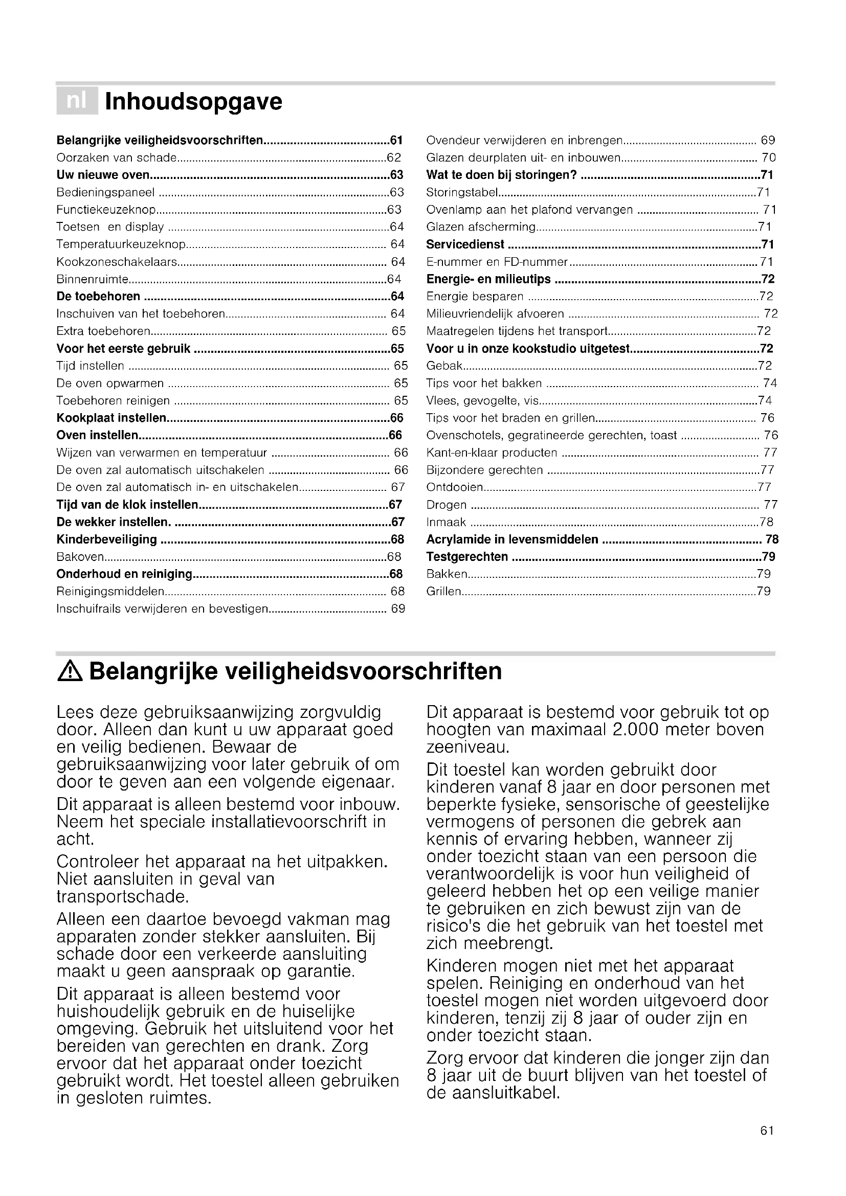 - Turn over after Z of the cooking time.61 é Inhoudsopgave [nl]Gebruiksaanwijzing Belangrijke veiligheidsvoorschriften......................................61 Oorzaken van schade.....................................................................62 Uw nieuwe oven........................................................................63 Bedieningspaneel ............................................................................63 Functiekeuzeknop............................................................................63 Toetsen en display .........................................................................64 Temperatuurkeuzeknop.................................................................. 64 Kookzoneschakelaars..................................................................... 64 Binnenruimte.....................................................................................64 De toebehoren ..........................................................................64 Inschuiven van het toebehoren..................................................... 64 Extra toebehoren.............................................................................. 65 Voor het eerste gebruik ...........................................................65 Tijd instellen ...................................................................................... 65 De oven opwarmen ......................................................................... 65 Toebehoren reinigen ....................................................................... 65 Kookplaat instellen...................................................................66 Oven instellen...........................................................................66 Wijzen van verwarmen en temperatuur ....................................... 66 De oven zal automatisch uitschakelen ........................................ 66 De oven zal automatisch in- en uitschakelen............................. 67 Tijd van de klok instellen.........................................................67 De wekker instellen. .................................................................67 Kinderbeveiliging .....................................................................68 Bakoven.............................................................................................68 Onderhoud en reiniging...........................................................68 Reinigingsmiddelen......................................................................... 68 Inschuifrails verwijderen en bevestigen....................................... 69 Ovendeur verwijderen en inbrengen............................................ 69 Glazen deurplaten uit- en inbouwen............................................. 70 Wat te doen bij storingen? ......................................................71 Storingstabel.....................................................................................71 Ovenlamp aan het plafond vervangen ........................................ 71 Glazen afscherming.........................................................................71 Servicedienst ............................................................................71 Enummer en FDnummer.............................................................. 71 Energie en milieutips ..............................................................72 Energie besparen ............................................................................72 Milieuvriendelijk afvoeren ............................................................... 72 Maatregelen tijdens het transport.................................................72 Voor u in onze kookstudio uitgetest.......................................72 Gebak.................................................................................................72 Tips voor het bakken ...................................................................... 74 Vlees, gevogelte, vis........................................................................74 Tips voor het braden en grillen..................................................... 76 Ovenschotels, gegratineerde gerechten, toast .......................... 76 Kant-en-klaar producten ................................................................. 77 Bijzondere gerechten ......................................................................77 Ontdooien..........................................................................................77 Drogen ............................................................................................... 77 Inmaak ...............................................................................................78 Acrylamide in levensmiddelen ................................................ 78 Testgerechten ...........................................................................79 Bakken...............................................................................................79 Grillen.................................................................................................79 : Belangrijke veiligheidsvoorschriften Lees deze gebruiksaanwijzing zorgvuldig door. Alleen dan kunt u uw apparaat goed en veilig bedienen. Bewaar de gebruiksaanwijzing voor later gebruik of om door te geven aan een volgende eigenaar. Dit apparaat is alleen bestemd voor inbouw. Neem het speciale installatievoorschrift in acht. Controleer het apparaat na het uitpakken. Niet aansluiten in geval van transportschade. Alleen een daartoe bevoegd vakman mag apparaten zonder stekker aansluiten. Bij schade door een verkeerde aansluiting maakt u geen aanspraak op garantie. Dit apparaat is alleen bestemd voor huishoudelijk gebruik en de huiselijke omgeving. Gebruik het uitsluitend voor het bereiden van gerechten en drank. Zorg ervoor dat het apparaat onder toezicht gebruikt wordt. Het toestel alleen gebruiken in gesloten ruimtes. Dit apparaat is bestemd voor gebruik tot op hoogten van maximaal 2.000 meter b