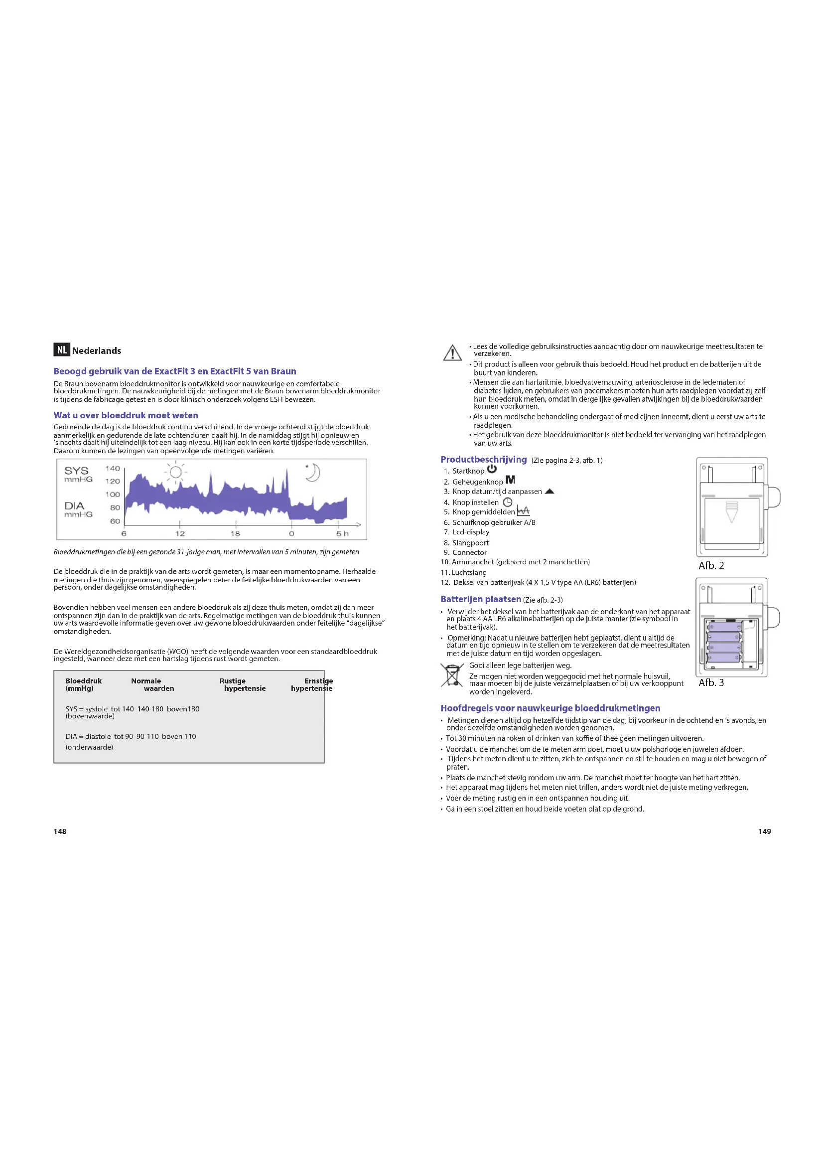 Nederlands Beoogd gebruik van de ExactFit 3 en ExactFit 5 van Braun De Braun bovenarm bloeddrukmonitor is ontwikkeld voor nauwkeurige en comfortabele bloeddrukmetingen. De nauwkeurigheid bij de metingen met de Braun bovenarm bloeddrukmonitor is tijdens de fabricage getest en is door klinisch onderzoek volgens ESH bewezen. Wat u over bloeddruk moet weten Gedurende de dag is de bloeddruk continu verschillend. In de vroege ochtend stijgt de bloeddruk aanmerkelijk en gedurende de late ochtenduren daalt hij. In de namiddag stijgt hij opnieuw en ’snachts daalt hij uiteindelijk tot een laag niveau. Hij kan ook in een korte tijdsperiode verschillen. Daarom kunnen de lezingen van opeenvolgende metingen variëren.Bloeddrukmetingen die bij een gezonde 31-jarige man, met intervallen van 5 minuten, zijn gemetenDe bloeddruk die in de praktijk van de arts wordt gemeten, is maar een momentopname. Herhaalde metingen die thuis zijn genomen, weerspiegelen beter de feitelijke bloeddrukwaarden van een persoon, onder dagelijkse omstandigheden.Bovendien hebben veel mensen een andere bloeddruk als zij deze thuis meten, omdat zij dan meer ontspannen zijn dan in de praktijk van de arts. Regelmatige metingen van de bloeddruk thuis kunnen uw arts waardevolle informatie geven over uw gewone bloeddrukwaarden onder feitelijke “dagelijkse” omstandigheden.De Wereldgezondheidsorganisatie (WGO) heeft de volgende waarden voor een standaardbloeddruk ingesteld, wanneer deze met een hartslag tijdens rust wordt gemeten.Bloeddruk Normale Rustige Ernstige (mmHg) waarden hypertensie hypertensieSYS = systole tot 140 140-180 boven180 (bovenwaarde)DIA = diastole tot 90 90-110 boven 110(onderwaarde)