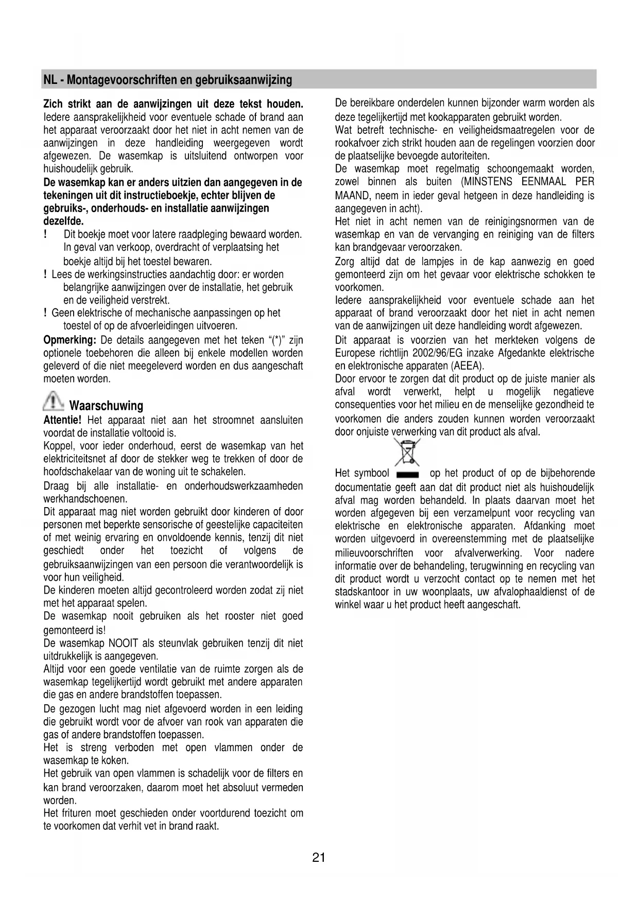 Dans l’éventualité où l’éclairage ne devait pas fonctionner, vérifier si les lampes ont été introduites correctement dans leur logement, avant de contacter le service après-vente.21 NL - Montagevoorschriften en gebruiksaanwijzing Zich strikt aan de aanwijzingen uit deze tekst houden. Iedere aansprakelijkheid voor eventuele schade of brand aan het apparaat veroorzaakt door het niet in acht nemen van de aanwijzingen in deze handleiding weergegeven wordt afgewezen. De wasemkap is uitsluitend ontworpen voor huishoudelijk gebruik. De wasemkap kan er anders uitzien dan aangegeven in de tekeningen uit dit instructieboekje, echter blijven de gebruiks-, onderhouds- en installatie aanwijzingen dezelfde. ! Dit boekje moet voor latere raadpleging bewaard worden. In geval van verkoop, overdracht of verplaatsing het boekje altijd bij het toestel bewaren. ! Lees de werkingsinstructies aandachtig door: er worden belangrijke aanwijzingen over de installatie, het gebruik en de veiligheid verstrekt. ! Geen elektrische of mechanische aanpassingen op het toestel of op de afvoerleidingen uitvoeren. Opmerking: De details aangegeven met het teken “(*)” zijn optionele toebehoren die alleen bij enkele modellen worden geleverd of die niet meegeleverd worden en dus aangeschaft moeten worden. Waarschuwing Attentie! Het apparaat niet aan het stroomnet aansluiten voordat de installatie voltooid is. Koppel, voor ieder onderhoud, eerst de wasemkap van het elektriciteitsnet af door de stekker weg te trekken of door de hoofdschakelaar van de woning uit te schakelen. Draag bij alle installatie- en onderhoudswerkzaamheden werkhandschoenen. Dit apparaat mag niet worden gebruikt door kinderen of door personen met beperkte sensorische of geestelijke capaciteiten of met weinig ervaring en onvoldoende kennis, tenzij dit niet geschiedt onder het toezicht of volgens de gebruiksaanwijzingen van een persoon die verantwoordelijk is voor hun veiligheid. De kinderen moeten altijd gecontroleerd worden zodat zij niet met het apparaat spelen. De wasemkap nooit gebruiken als het rooster niet goed gemonteerd is! De wasemkap NOOIT als steunvlak gebruiken tenzij dit niet uitdrukkelijk is aangegeven. Altijd voor een goede ventilatie van de ruimte zorgen als de wasemkap tegelijkertijd wordt gebruikt met andere apparaten die gas en andere brandstoffen toepassen. De gezogen lucht mag niet afgevoerd worden in een leiding die gebruikt wordt voor de afvoer van rook van apparaten die gas of andere brandstoffen toepassen. Het is streng verboden met open vlammen onder de wasemkap te koken. Het gebruik van open vlammen is schadelijk voor de filters en kan brand veroorzaken, daarom moet het absoluut vermeden worden. Het frituren moet geschieden onder voortdurend toezicht om te voorkomen dat verhit vet in brand raakt. De bereikbare onderdelen kunnen bijzonder warm worden als deze tegelijkertijd met kookapparaten gebruikt worden. Wat betreft technische- en veiligheidsmaatregelen voor de rookafvoer zich strikt houden aan de regelingen voorzien door de plaatselijke bevoegde autoriteiten. De wasemkap moet regelmatig schoongemaakt worden, zowel binnen als buiten (MINSTENS EENMAAL PER MAAND, neem in ieder geval hetgeen in deze handleiding is aangegeven in acht). Het niet in acht nemen van de reinigingsnormen van de wasemkap en van de vervanging en reiniging van de filters kan brandgevaar veroorzaken. Zorg altijd dat de lampjes in de kap aanwezig en goed gemonteerd zijn om het gevaar voor elektrische schokken te voorkomen. Iedere aansprakelijkheid voor eventuele schade aan het apparaat of brand veroorzaakt door het niet in acht nemen van de aanwijzingen uit deze handleiding wordt afgewezen. Dit apparaat is voorzien van het merkteken volgens de Europese richtlijn 2002/96/EG inzake Afgedankte elektrische en elektronische apparaten (AEEA). Door ervoor te zorgen dat dit product op de juiste manier als afval wordt verwerkt, helpt u mogelijk negatieve consequenties voor het milieu en de menselijke gezondheid te voorkomen die anders zouden kunnen worden veroorzaakt door onjuiste verwerking van dit product als afval. Het symbool op het product of op de bijbehorende documentatie geeft aan dat dit product niet als huishoudelijk afval mag worden behandeld. In plaats daarvan moet het worden afgegeven bij een verzamelpunt voor recycling van elektrische en elektronische apparaten. Afdanking moet worden uitgevoerd in overeenstemming met de plaatselijke milieuvoorschriften voor afvalverwerking. Voor nadere informatie over de behandeling, terugwinning en recycling van dit product wordt u verzocht contact op te nemen met het stadskantoor in uw woonplaats, uw afvalophaaldienst of de winkel waar u het product heeft aangeschaft.22 Het gebruik De kap is vervaardigd voor gebruik in de afzuigversie met afvoer naar buiten, of de filtrerende versie, met luchtcirculatie. Uitvoering als afzuigend apparaat De aangezogen rook en damp worden naar buiten geleid via een afvoerpijp die is aangesloten op de verbindingsring aan de bovenkant van de wasemkap. Attentie: De afvoerpijp wordt hierbij niet geleverd en moet apart aangekocht worden. De middellijn van de afvoerpijp moet even groot zijn als die van de verbindingsring. De horizontale stukken van de buis moeten enigszins omhoog hellen (ongeveer 10°) om de lucht gemakkelijk naar buiten te voeren. Note. Als de wasemkap reeds is voorzien van koolstoffilter dan moet u dit verwijderen. Verbind de wasemkap aan wandafvoerpijpen en afvoeropeningen met dezelfde diameter als de luchtuitgang (verbindingsflens).Het gebruik van wandafvoerpijpen of afvoeropeningen met een kleinere diameter zal leiden tot een vermogensverlies en een sterke toename van het bedrijfsgeluid. Iedere aansprakelijkheid hiervoor wordt afgewezen. ! De lengte van het afvoerkanaal moet zo kort mogelijk zijn. ! Gebruik zo min mogelijk bochten (maximaal toegestane hoek: 90°). ! Vermijd grote verschillen in doorsnede. ! Gebruik een buis met een zo glad mogelijke binnenka
