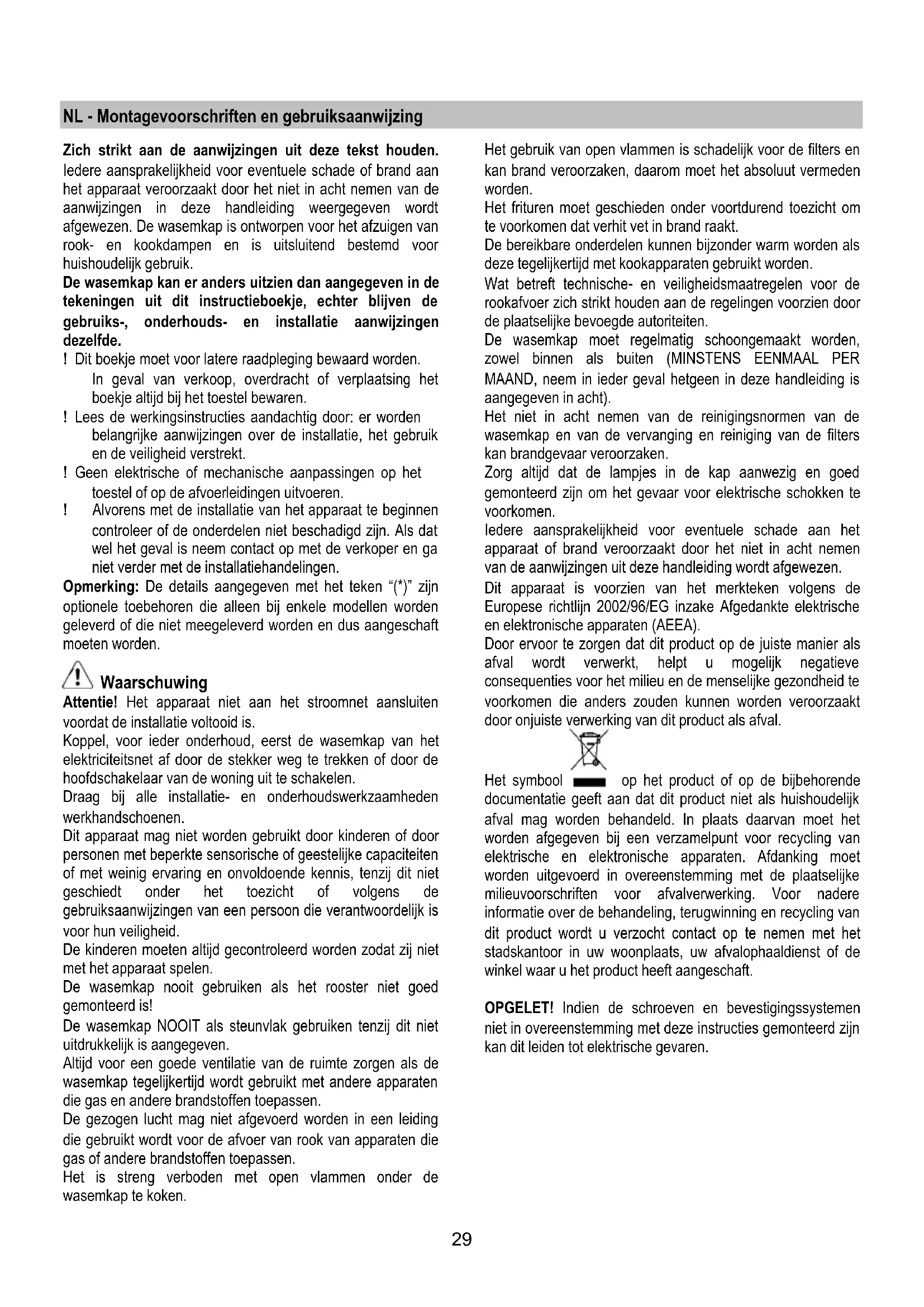 - Filtre à charbon actif NON lavable. Filtre à charbon actif lavable Le filtre à charbon peut être nettoyé tous les deux mois avec de l’eau chaude et au moyen de détergents appropriés ou dans le lave-vaisselle à 65°C (dans le cas de lavage dans le lave-vaisselle suivre un cycle de lavage complet sans vaisselle à l’intérieur). Enlever l’eau qui excède en faisant attention de ne pas abîmer le filtre, ensuite enlever le coussinet posé à l’intérieur du châssis en plastique et le mettre dans le four pendant 10 minutes à 100°C pour le sécher définitivement. Remplacer le coussinet tous les 3 ans et chaque fois que le filtre sera abîmé. Filtre à charbon actif NON lavable La saturation du charbon actif se constate aprés un emploi plus ou mois long, selon la fréquence d'utilisation et la régularité du nettoyage du filtre à graisses. En tout cas, il est nécessaire de changer le filtre aprés, au maximum, quatre mois. IL NE PEUT PAS être nettoyé ou régénéré. Montage Accrocher le filtre au charbon actif d’abord à l’arrière de la languette métallique de la hotte, puis à l’avant avec les deux pommeaux. Démontage Enlever le filtre au charbon actif en tournant de 90° les pommeaux qui le fixent à la hotte. Remplacement des lampes La hotte est dotée d’un système d’éclairage basé sur la technologie LED. Les LEDS garantissent un éclairage optimal, une durée jusqu’à 10 fois supérieures aux ampoules traditionnelles et permettent une épargne de 90% en énergie électrique. Pour le remplacement, s’adresser au service d’assistance technique.29 NL - Montagevoorschriften en gebruiksaanwijzing Zich strikt aan de aanwijzingen uit deze tekst houden. Iedere aansprakelijkheid voor eventuele schade of brand aan het apparaat veroorzaakt door het niet in acht nemen van de aanwijzingen in deze handleiding weergegeven wordt afgewezen. De wasemkap is ontworpen voor het afzuigen van rook- en kookdampen en is uitsluitend bestemd voor huishoudelijk gebruik. De wasemkap kan er anders uitzien dan aangegeven in de tekeningen uit dit instructieboekje, echter blijven de gebruiks-, onderhouds- en installatie aanwijzingen dezelfde. ! Dit boekje moet voor latere raadpleging bewaard worden. In geval van verkoop, overdracht of verplaatsing het boekje altijd bij het toestel bewaren. ! Lees de werkingsinstructies aandachtig door: er worden belangrijke aanwijzingen over de installatie, het gebruik en de veiligheid verstrekt. ! Geen elektrische of mechanische aanpassingen op het toestel of op de afvoerleidingen uitvoeren. ! Alvorens met de installatie van het apparaat te beginnen controleer of de onderdelen niet beschadigd zijn. Als dat wel het geval is neem contact op met de verkoper en ga niet verder met de installatiehandelingen. Opmerking: De details aangegeven met het teken “(*)” zijn optionele toebehoren die alleen bij enkele modellen worden geleverd of die niet meegeleverd worden en dus aangeschaft moeten worden. Waarschuwing Attentie! Het apparaat niet aan het stroomnet aansluiten voordat de installatie voltooid is. Koppel, voor ieder onderhoud, eerst de wasemkap van het elektriciteitsnet af door de stekker weg te trekken of door de hoofdschakelaar van de woning uit te schakelen. Draag bij alle installatie- en onderhoudswerkzaamheden werkhandschoenen. Dit apparaat mag niet worden gebruikt door kinderen of door personen met beperkte sensorische of geestelijke capaciteiten of met weinig ervaring en onvoldoende kennis, tenzij dit niet geschiedt onder het toezicht of volgens de gebruiksaanwijzingen van een persoon die verantwoordelijk is voor hun veiligheid. De kinderen moeten altijd gecontroleerd worden zodat zij niet met het apparaat spelen. De wasemkap nooit gebruiken als het rooster niet goed gemonteerd is! De wasemkap NOOIT als steunvlak gebruiken tenzij dit niet uitdrukkelijk is aangegeven. Altijd voor een goede ventilatie van de ruimte zorgen als de wasemkap tegelijkertijd wordt gebruikt met andere apparaten die gas en andere brandstoffen toepassen. De gezogen lucht mag niet afgevoerd worden in een leiding die gebruikt wordt voor de afvoer van rook van apparaten die gas of andere brandstoffen toepassen. Het is streng verboden met open vlammen onder de wasemkap te koken. Het gebruik van open vlammen is schadelijk voor de filters en kan brand veroorzaken, daarom moet het absoluut vermeden worden. Het frituren moet geschieden onder voortdurend toezicht om te voorkomen dat verhit vet in brand raakt. De bereikbare onderdelen kunnen bijzonder warm worden als deze tegelijkertijd met kookapparaten gebruikt worden. Wat betreft technische- en veiligheidsmaatregelen voor de rookafvoer zich strikt houden aan de regelingen voorzien door de plaatselijke bevoegde autoriteiten. De wasemkap moet regelmatig schoongemaakt worden, zowel binnen als buiten (MINSTENS EENMAAL PER MAAND, neem in ieder geval hetgeen in deze handleiding is aangegeven in acht). Het niet in acht nemen van de reinigingsnormen van de wasemkap en van de vervanging en reiniging van de filters kan brandgevaar veroorzaken. Zorg altijd dat de lampjes in de kap aanwezig en goed gemonteerd zijn om het gevaar voor elektrische schokken te voorkomen. Iedere aansprakelijkheid voor eventuele schade aan het apparaat of brand veroorzaakt door het niet in acht nemen van de aanwijzingen uit deze handleiding wordt afgewezen. Dit apparaat is voorzien van het merkteken volgens de Europese richtlijn 2002/96/EG inzake Afgedankte elektrische en elektronische apparaten (AEEA). Door ervoor te zorgen dat dit product op de juiste manier als afval wordt verwerkt, helpt u mogelijk negatieve consequenties voor het milieu en de menselijke gezondheid te voorkomen die anders zouden kunnen worden veroorzaakt door onjuiste verwerking van dit product als afval. Het symbool op het product of op de bijbehorende documentatie geeft aan dat dit product niet als huishoudelijk afval mag worden behandeld. In plaats daarvan moet het worden afg