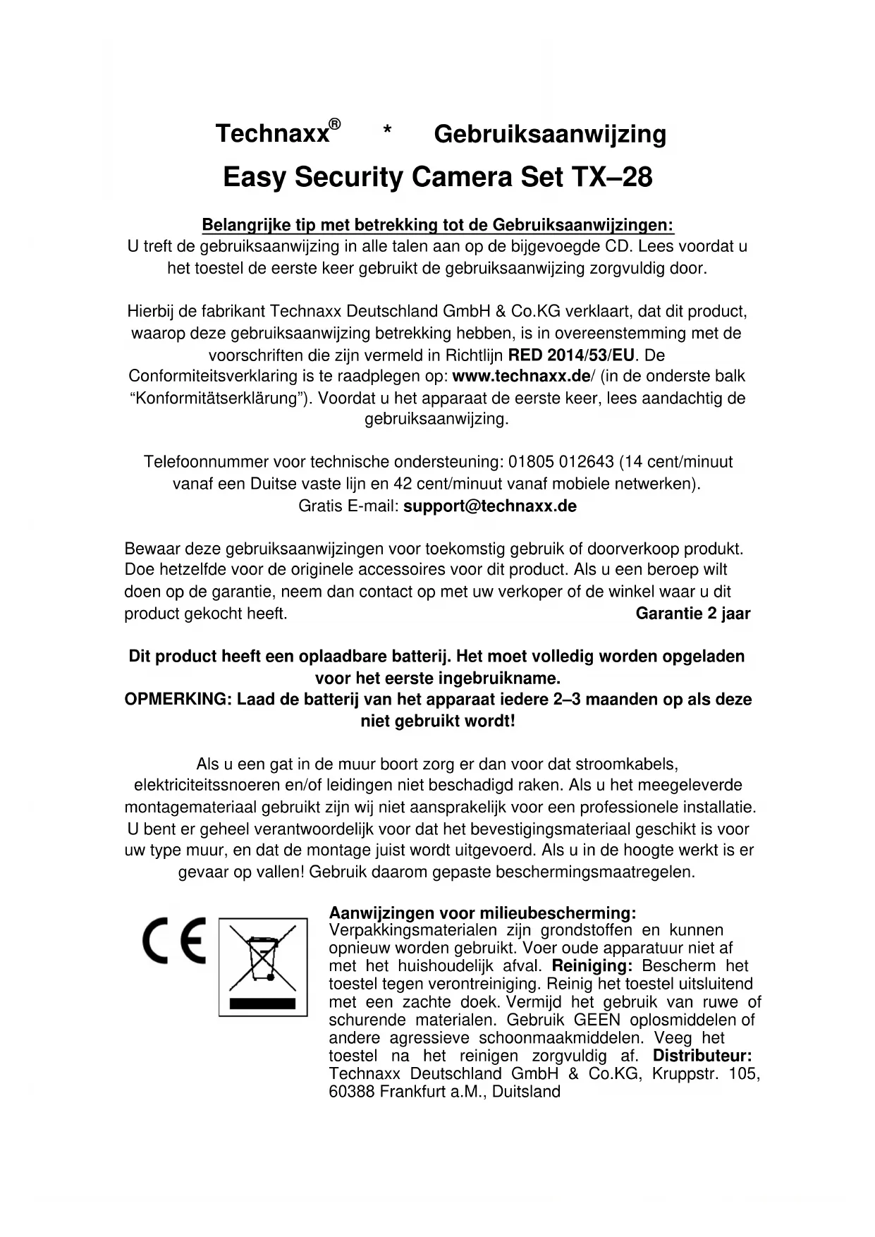 Verpakkingsmaterialen zijn grondstoffen en{kunnen opnieuw worden gebruikt. Voer oude apparatuur nicht af met het huishoudelijk afval. Reiniging: Bescherm het toestel gegen verontreiniging. Reinig het toestel uitsluitend met een zachtde doeK.Vermijd het gebruik van ruwe of schurende materialen. Gebruik GEEN oplosmiddelen of andere agressieve schoonmaakmiddelen. Veeg het toestel na het reinigen zorgvuldig af.Distributeur: Technaxx Deutschland GmbH & Co.KG, Kruppstr. 105, 60388 Frankfurt a.M., Duitsland