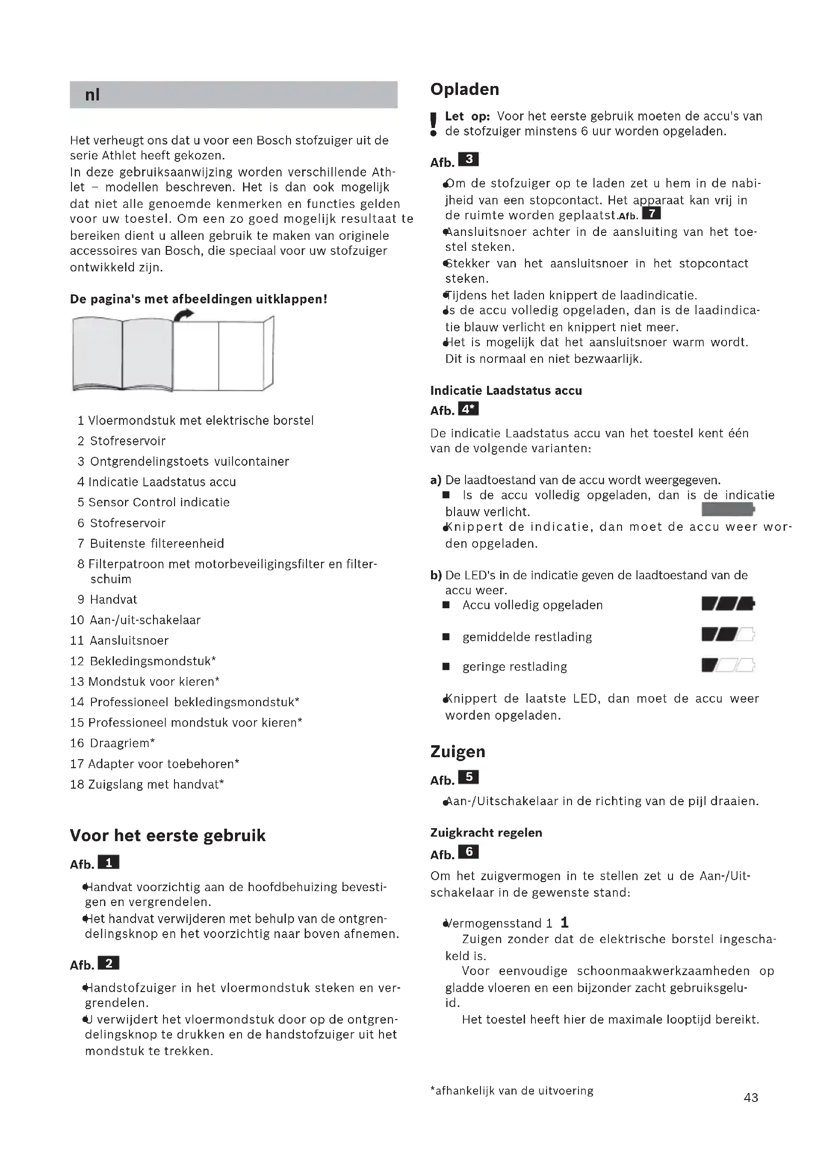 Het verheugt ons dat u voor een Bosch stofzuiger uit de serie Athlet heeft gekozen. In deze gebruiksaanwijzing worden verschillende Ath- let – modellen beschreven. Het is dan ook mogelijk dat niet alle genoemde kenmerken en functies gelden voor uw toestel. Om een zo goed mogelijk resultaat te bereiken dient u alleen gebruik te maken van originele accessoires van Bosch, die speciaal voor uw stofzuiger ontwikkeld zijn. De pagina's met afbeeldingen uitklappen! 1 Vloermondstuk met elektrische borstel 2 Stofreservoir 3 Ontgrendelingstoets vuilcontainer 4 Indicatie Laadstatus accu 5 Sensor Control indicatie 6 Stofreservoir 7 Buitenste filtereenheid 8 Filterpatroon met motorbeveiligingsfilter en filter- schuim 9 Handvat 10 Aan-/uit-schakelaar 11 Aansluitsnoer 12 Bekledingsmondstuk* 13 Mondstuk voor kieren* 14 Professioneel bekledingsmondstuk* 15 Professioneel mondstuk voor kieren* 16 Draagriem* 17 Adapter voor toebehoren* 18 Zuigslang met handvat* Voor het eerste gebruik Afb.