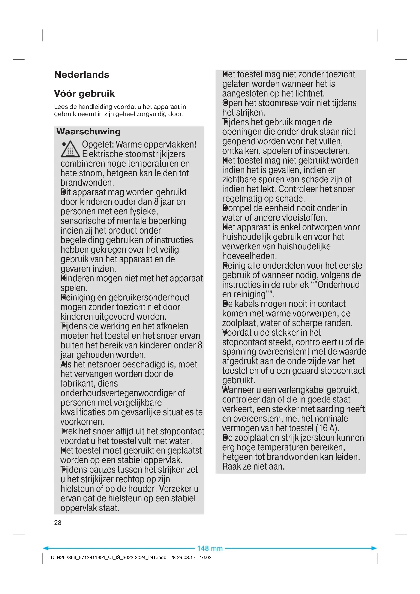 DLB262366_5712811991_UI_IS_3022-3024_INT.indb 27 29.08.17 16:02Nederlands Vóór gebruik Lees de handleiding voordat u het apparaat in gebruik neemt in zijn geheel zorgvuldig door. Waarschuwing