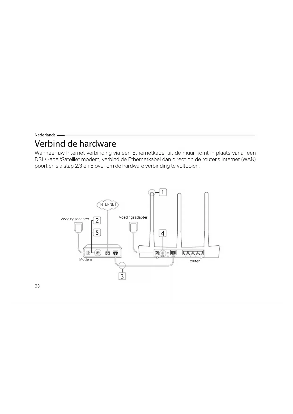 Verbind de modem met de Internet (of WAN) poort van de router met een Ethernetkabel.