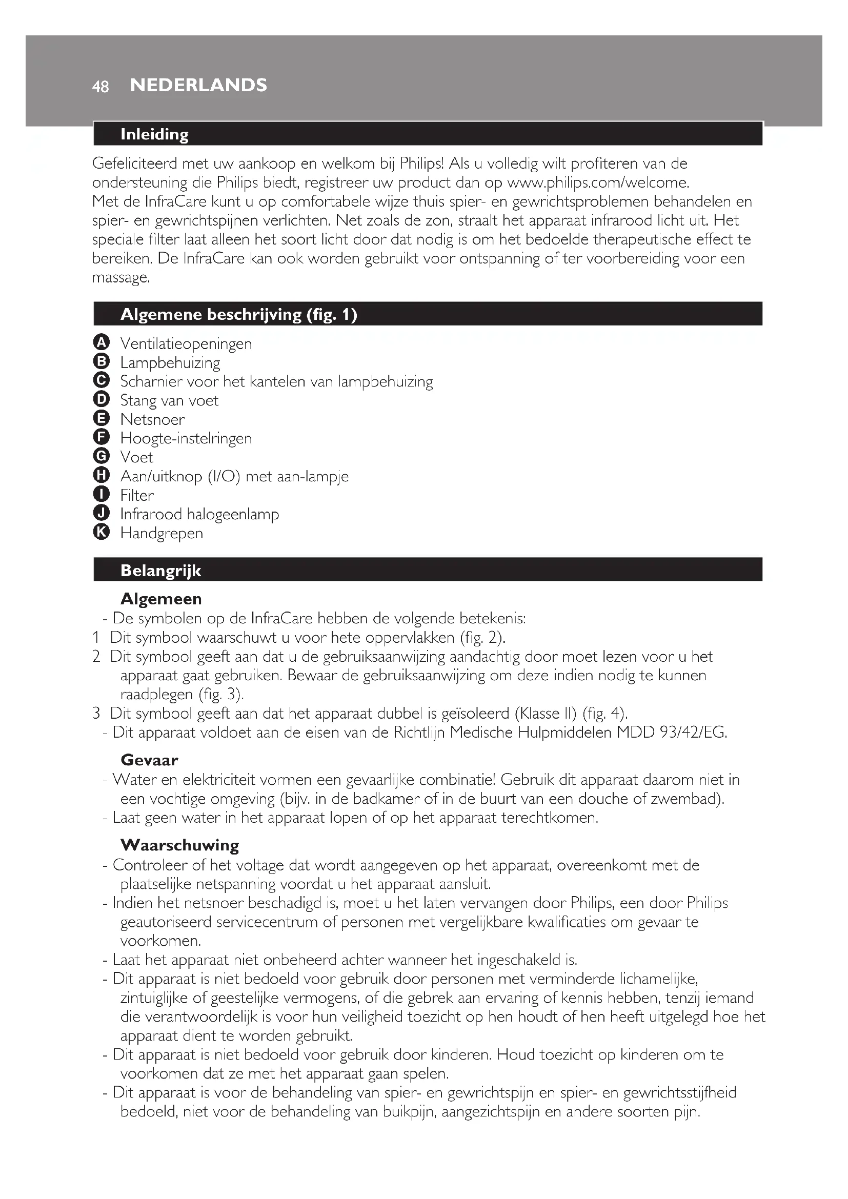 Gefeliciteerd met uw aankoop en welkom bij Philips! Als u volledig wilt proteren van de ondersteuning die Philips biedt, registreer uw product dan op www.philips.com/welcome. Met de InfraCare kunt u op comfortabele wijze thuis spier- en gewrichtsproblemen behandelen en spier- en gewrichtspijnen verlichten. Net zoals de zon, straalt het apparaat infrarood licht uit. Het speciale lter laat alleen het soort licht door dat nodig is om het bedoelde therapeutische effect te bereiken. De InfraCare kan ook worden gebruikt voor ontspanning of ter voorbereiding voor een massage.