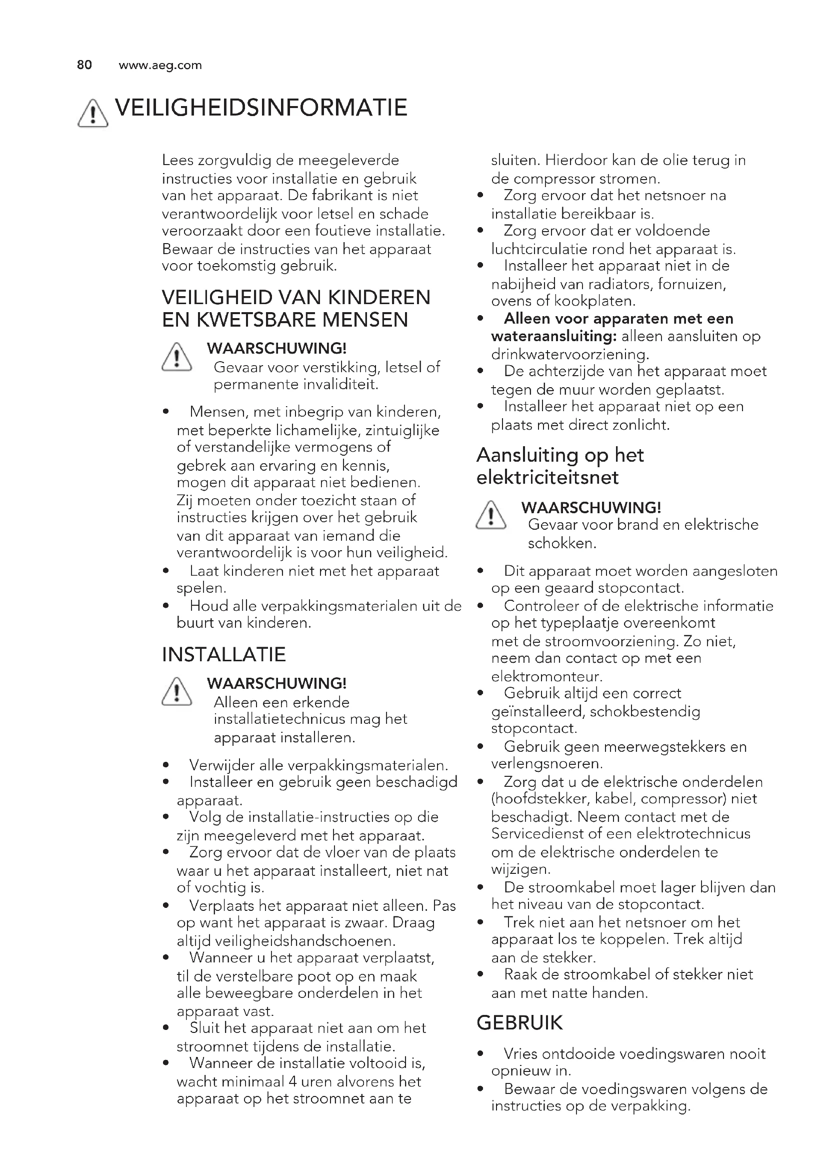 www.aeg.com NEDERLANDS 79VEILIGHEIDSINFORMATIE Lees zorgvuldig de meegeleverde instructies voor installatie en gebruik van het apparaat. De fabrikant is niet verantwoordelijk voor letsel en schade veroorzaakt door een foutieve installatie. Bewaar de instructies van het apparaat voor toekomstig gebruik.