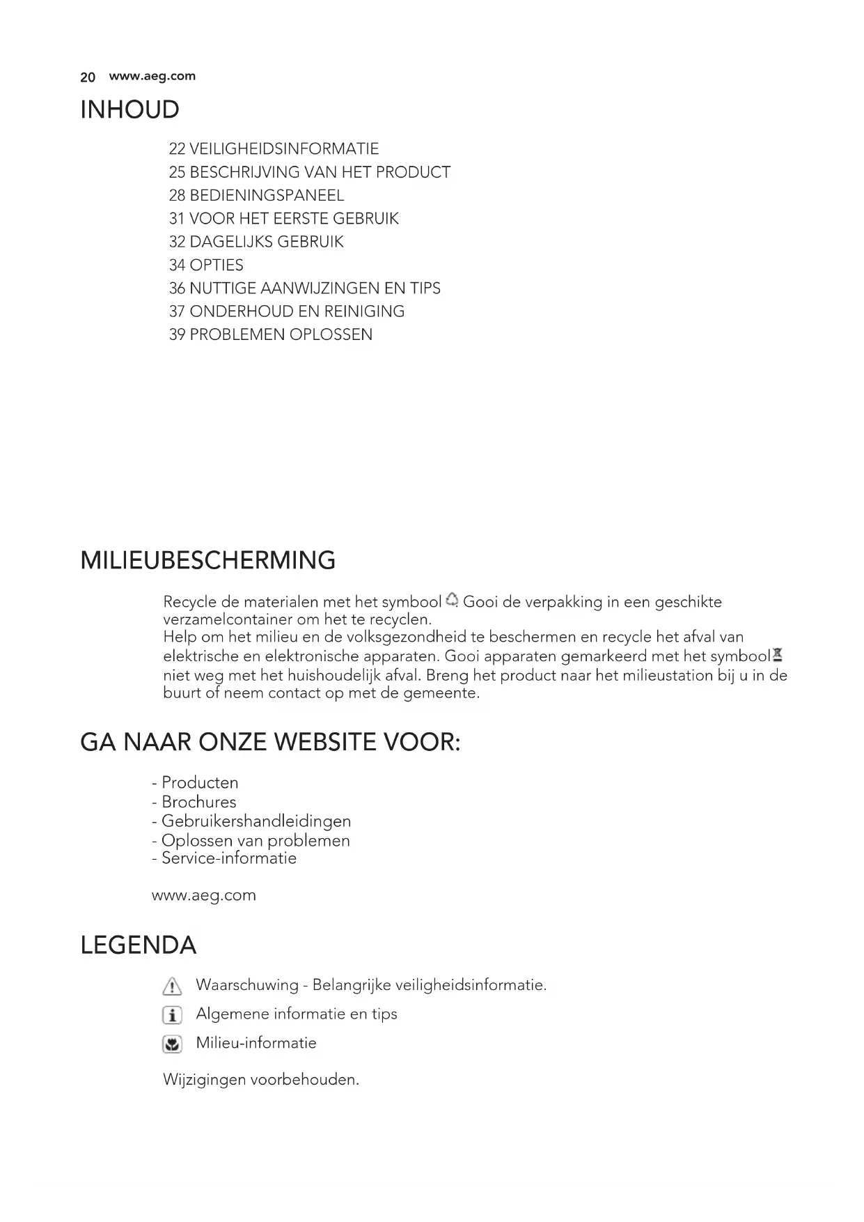 39 PROBLEMEN OPLOSSEN MILIEUBESCHERMING Recycle de materialen met het symbool . Gooi de verpakking in een geschikte verzamelcontainer om het te recyclen. Help om het milieu en de volksgezondheid te beschermen en recycle het afval van elektrische en elektronische apparaten. Gooi apparaten gemarkeerd met het symbool niet weg met het huishoudelijk afval. Breng het product naar het milieustation bij u in de buurt of neem contact op met de gemeente. GA NAAR ONZE WEBSITE VOOR: - Producten - Brochures - Gebruikershandleidingen - Oplossen van problemen - Service-informatie www.aeg.com LEGENDA Waarschuwing - Belangrijke veiligheidsinformatie. Algemene informatie en tips Milieu-informatie Wijzigingen voorbehouden.
