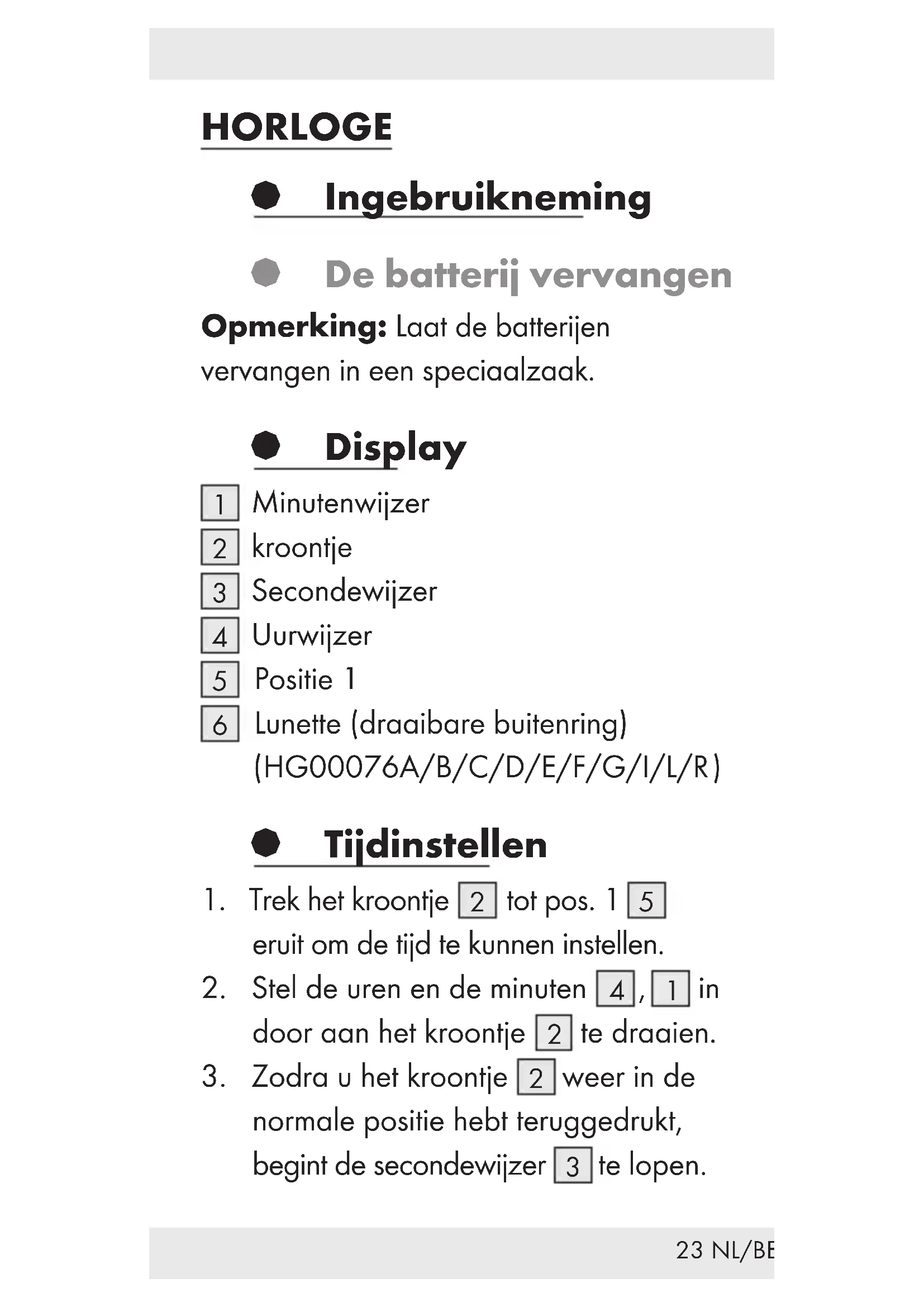 tegen de klok in om het begin van een tijdsbestek te markeren.25 NL/BE § Reiniging en onderhoud Reinig het product alleen aan de buitenzijde met een zachte, droge doek. § Verwijdering De verpakking bestaat uit milieuvriendelijke grondstoffen die U via de plaatselijke recyclecontainers kunt afvoeren. Informatie over de mogelijkheden om het uitgediende artikel na gebruik af te voeren, verstrekt uw gemeentelijke overheid.26 NL/BE