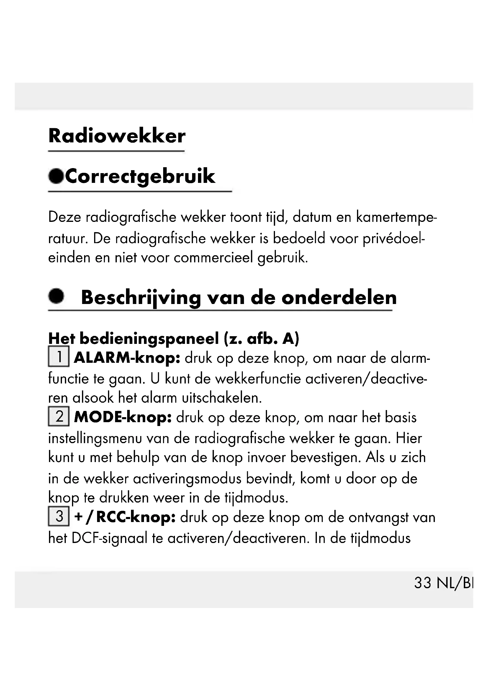 Correct gebruik ......................................... Pagina 33 Beschrijving van de onderdelen ............................................ Pagina 33 Technische gegevens ........................... Pagina 36 Omvang van de levering ................ Pagina 36 Algemene veiligheidsinstructies ........................... Pagina 36 Veiligheidsinstructies voor de batterijen .................................. Pagina 37 Voor de ingebruikname ................... Pagina 3932 NL/BE Ingebruikname DCF-signaal automatisch of manueel instellen ... Pagina 41 Basisinstellingen uitvoeren .................................. Pagina 42 Wekkertijd instellen ............................................. Pagina 47 Wekkerfunctie in- / uitschakelen ......................... Pagina 48 Wekkersignaal uitschakelen .............................. Pagina 48 Sluimerfunctie gebruiken .................................... Pagina 49 LC-Display verlichten ........................................... Pagina 50 Eenheid van de temperatuurweergave veranderen .......................................................... Pagina 50 Batterijen vervangen .......................... Pagina 50 Storingen verhelpen ............................ Pagina 51 Reiniging en onderhoud................... Pagina 51 Verwijdering ............................................... Pagina 51 Conformiteitsverklaring ................... Pagina 5233 NL/BE Radiowekker Correct gebruik Deze radiografische wekker toont tijd, datum en kamertempe- ratuur. De radiografische wekker is bedoeld voor privédoel- einden en niet voor commercieel gebruik. Beschrijving van de onderdelen Het bedieningspaneel (z. afb. A)