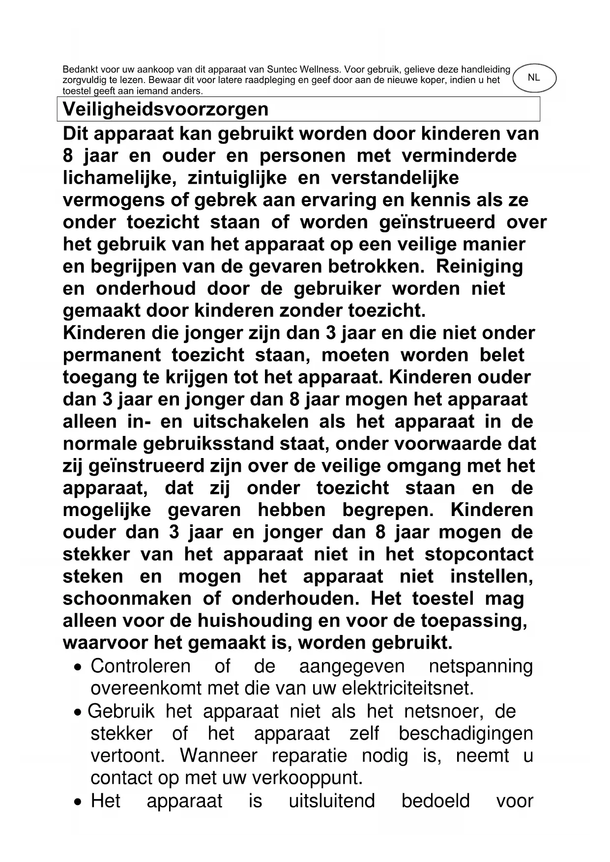 CoolBreeze SUNTEC WELLNESS GMBH / HOLZSTRASSE 2 / 40 221 DÜSSELDORF / GERMANIABedankt voor uw aankoop van dit apparaat van Suntec Wellness. Voor gebruik, gelieve deze handleiding zorgvuldig te lezen. Bewaar dit voor latere raadpleging en geef door aan de nieuwe koper, indien u het toestel geeft aan iemand anders. Veiligheidsvoorzorgen Dit apparaat kan gebruikt worden door kinderen van 8 jaar en ouder en personen met verminderde lichamelijke, zintuiglijke en verstandelijke vermogens of gebrek aan ervaring en kennis als ze onder toezicht staan of worden geïnstrueerd over het gebruik van het apparaat op een veilige manier en begrijpen van de gevaren betrokken. Reiniging en onderhoud door de gebruiker worden niet gemaakt door kinderen zonder toezicht. Kinderen die jonger zijn dan 3 jaar en die niet onder permanent toezicht staan, moeten worden belet toegang te krijgen tot het apparaat. Kinderen ouder dan 3 jaar en jonger dan 8 jaar mogen het apparaat alleen in- en uitschakelen als het apparaat in de normale gebruiksstand staat, onder voorwaarde dat zij geïnstrueerd zijn over de veilige omgang met het apparaat, dat zij onder toezicht staan en de mogelijke gevaren hebben begrepen. Kinderen ouder dan 3 jaar en jonger dan 8 jaar mogen de stekker van het apparaat niet in het stopcontact steken en mogen het apparaat niet instellen, schoonmaken of onderhouden. Het toestel mag alleen voor de huishouding en voor de toepassing, waarvoor het gemaakt is, worden gebruikt.