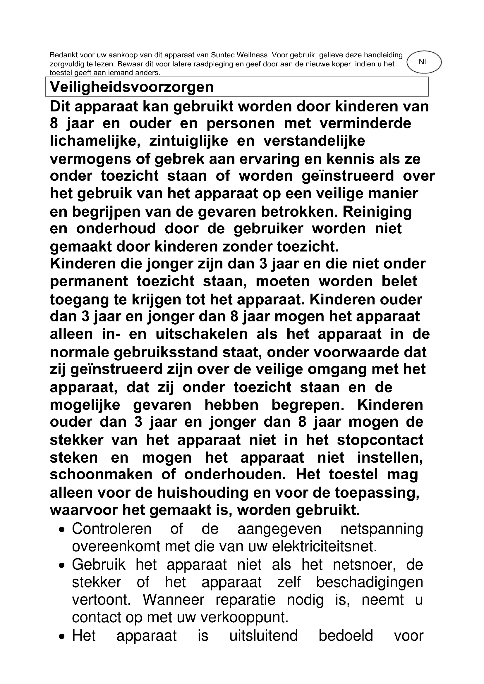 CoolBreeze SUNTEC WELLNESS GMBH / HOLZSTRASSE 2 / 40 221 DÜSSELDORF / GERMANIABedankt voor uw aankoop van dit apparaat van Suntec Wellness. Voor gebruik, gelieve deze handleiding zorgvuldig te lezen. Bewaar dit voor latere raadpleging en geef door aan de nieuwe koper, indien u het toestel geeft aan iemand anders. Veiligheidsvoorzorgen Dit apparaat kan gebruikt worden door kinderen van 8 jaar en ouder en personen met verminderde lichamelijke, zintuiglijke en verstandelijke vermogens of gebrek aan ervaring en kennis als ze onder toezicht staan of worden geïnstrueerd over het gebruik van het apparaat op een veilige manier en begrijpen van de gevaren betrokken. Reiniging en onderhoud door de gebruiker worden niet gemaakt door kinderen zonder toezicht. Kinderen die jonger zijn dan 3 jaar en die niet onder permanent toezicht staan, moeten worden belet toegang te krijgen tot het apparaat. Kinderen ouder dan 3 jaar en jonger dan 8 jaar mogen het apparaat alleen in- en uitschakelen als het apparaat in de normale gebruiksstand staat, onder voorwaarde dat zij geïnstrueerd zijn over de veilige omgang met het apparaat, dat zij onder toezicht staan en de mogelijke gevaren hebben begrepen. Kinderen ouder dan 3 jaar en jonger dan 8 jaar mogen de stekker van het apparaat niet in het stopcontact steken en mogen het apparaat niet instellen, schoonmaken of onderhouden. Het toestel mag alleen voor de huishouding en voor de toepassing, waarvoor het gemaakt is, worden gebruikt.