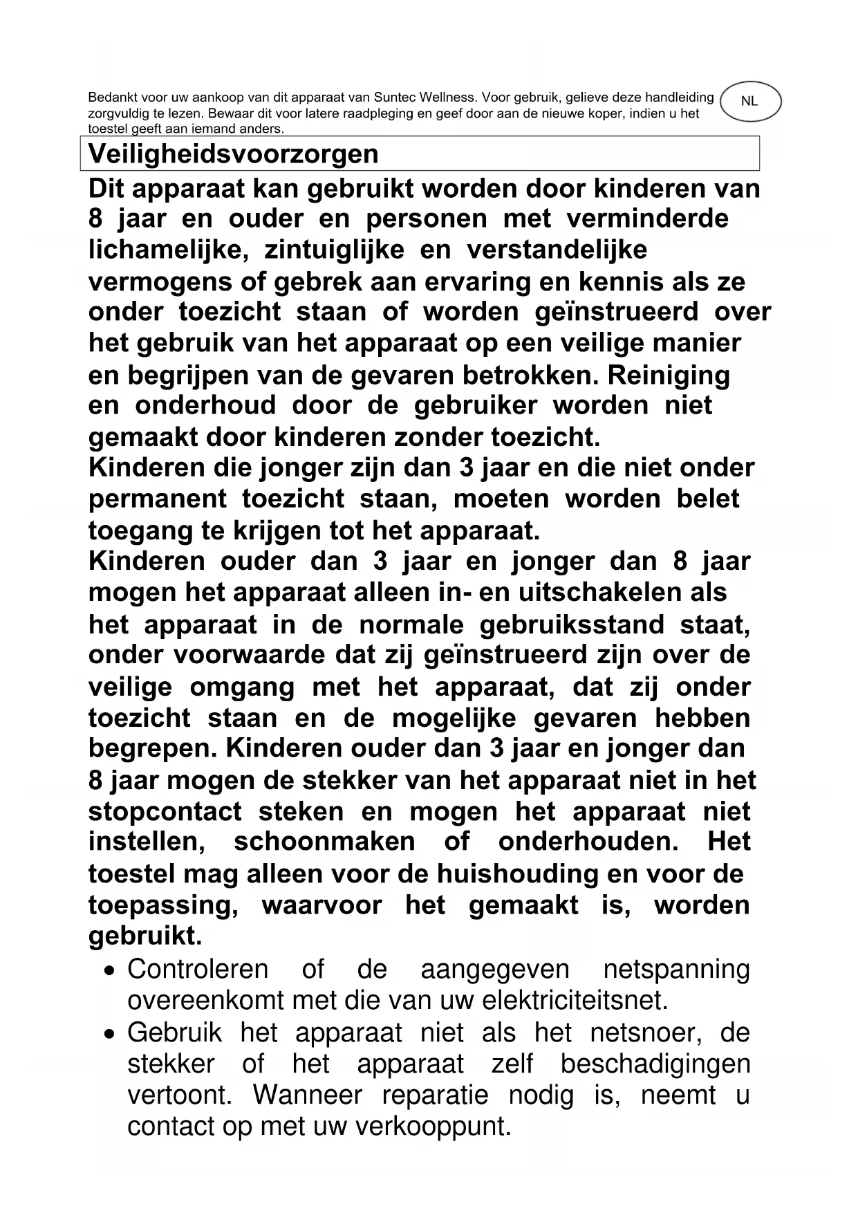 CoolBreeze SUNTEC WELLNESS GMBH / HOLZSTRASSE 2 / 40 221 DÜSSELDORF / GERMANIABedankt voor uw aankoop van dit apparaat van Suntec Wellness. Voor gebruik, gelieve deze handleiding zorgvuldig te lezen. Bewaar dit voor latere raadpleging en geef door aan de nieuwe koper, indien u het toestel geeft aan iemand anders. Veiligheidsvoorzorgen Dit apparaat kan gebruikt worden door kinderen van 8 jaar en ouder en personen met verminderde lichamelijke, zintuiglijke en verstandelijke vermogens of gebrek aan ervaring en kennis als ze onder toezicht staan of worden geïnstrueerd over het gebruik van het apparaat op een veilige manier en begrijpen van de gevaren betrokken. Reiniging en onderhoud door de gebruiker worden niet gemaakt door kinderen zonder toezicht. Kinderen die jonger zijn dan 3 jaar en die niet onder permanent toezicht staan, moeten worden belet toegang te krijgen tot het apparaat. Kinderen ouder dan 3 jaar en jonger dan 8 jaar mogen het apparaat alleen in- en uitschakelen als het apparaat in de normale gebruiksstand staat, onder voorwaarde dat zij geïnstrueerd zijn over de veilige omgang met het apparaat, dat zij onder toezicht staan en de mogelijke gevaren hebben begrepen. Kinderen ouder dan 3 jaar en jonger dan 8 jaar mogen de stekker van het apparaat niet in het stopcontact steken en mogen het apparaat niet instellen, schoonmaken of onderhouden. Het toestel mag alleen voor de huishouding en voor de toepassing, waarvoor het gemaakt is, worden gebruikt.