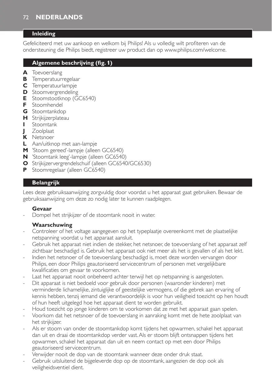 Lees deze gebruiksaanwijzing zorgvuldig door voordat u het apparaat gaat gebruiken. Bewaar de gebruiksaanwijzing om deze zo nodig later te kunnen raadplegen. Gevaar -- Dompel het strijkijzer of de stoomtank nooit in water. Waarschuwing -- Controleer of het voltage aangegeven op het typeplaatje overeenkomt met de plaatselijke netspanning voordat u het apparaat aansluit. -- Gebruik het apparaat niet indien de stekker, het netsnoer, de toevoerslang of het apparaat zelf zichtbaar beschadigd is. Gebruik het apparaat ook niet meer als het is gevallen of als het lekt. -- Indien het netsnoer of de toevoerslang beschadigd is, moet deze worden vervangen door Philips, een door Philips geautoriseerd servicecentrum of personen met vergelijkbare kwalificaties om gevaar te voorkomen. -- Laat het apparaat nooit onbeheerd achter terwijl het op netspanning is aangesloten. -- Dit apparaat is niet bedoeld voor gebruik door personen (waaronder kinderen) met verminderde lichamelijke, zintuiglijke of geestelijke vermogens, of die gebrek aan ervaring of kennis hebben, tenzij iemand die verantwoordelijk is voor hun veiligheid toezicht op hen houdt of hun heeft uitgelegd hoe het apparaat dient te worden gebruikt. -- Houd toezicht op jonge kinderen om te voorkomen dat ze met het apparaat gaan spelen. -- Voorkom dat het netsnoer of de toevoerslang in aanraking komt met de hete zoolplaat van het strijkijzer. -- Als er stoom van onder de stoomtankdop komt tijdens het opwarmen, schakel het apparaat dan uit en draai de stoomtankdop verder vast. Als er stoom blijft ontsnappen tijdens het opwarmen, schakel het apparaat dan uit en neem contact op met een door Philips geautoriseerd servicecentrum. -- Verwijder nooit de dop van de stoomtank wanneer deze onder druk staat. -- Gebruik uitsluitend de bijgeleverde dop op de stoomtank, aangezien de dop ook als veiligheidsventiel dient.