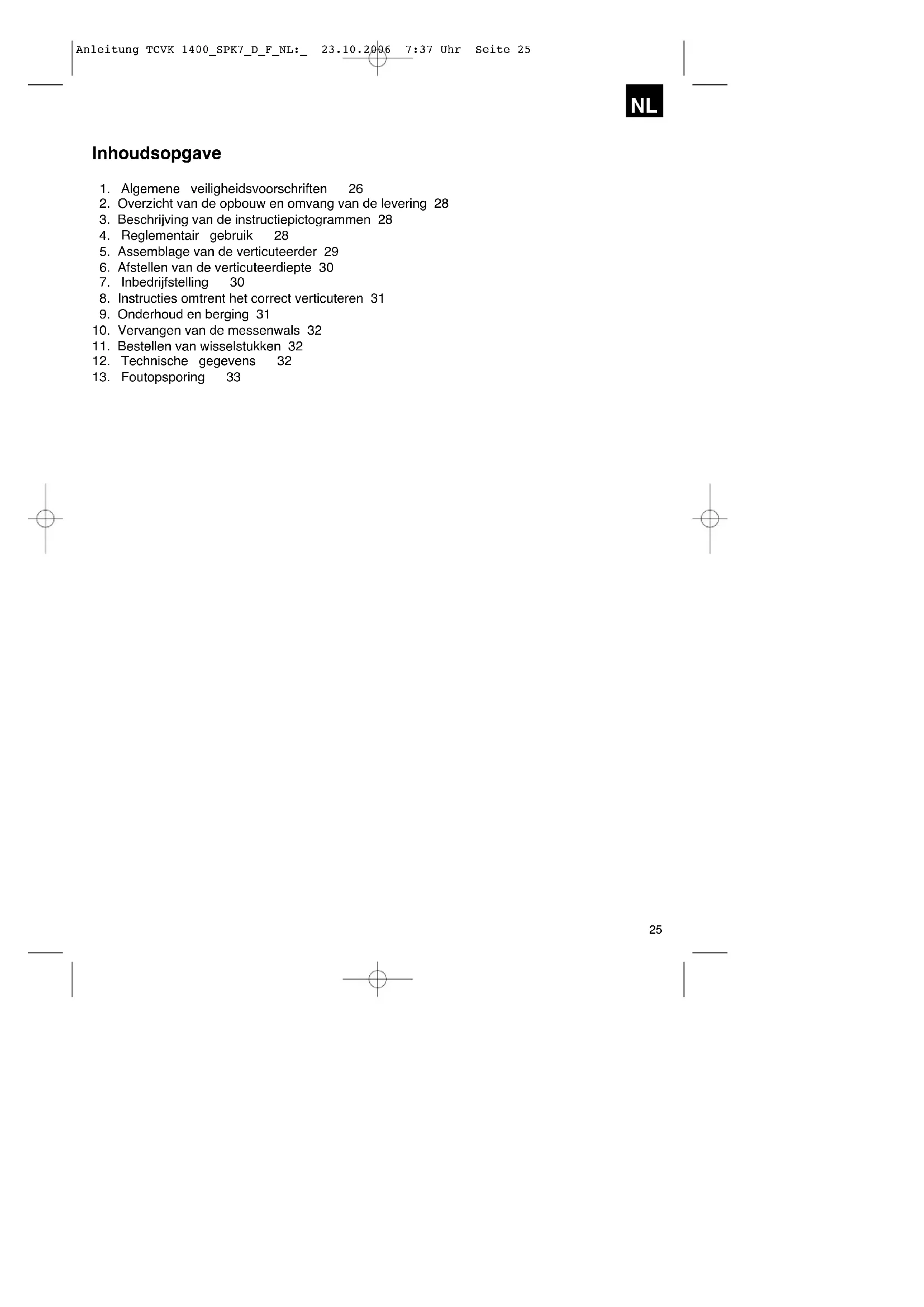 Anleitung TCVK 1400_SPK7_D_F_NL:_ 23.10.2006 7:37 Uhr Seite 25Lees de volgende veiligheidsvoorschriften en de handleiding aandachtig door voordat u met deze elektrische verticuteerder werkt. Mocht u dit toestel aan andere personen doorgeven, gelieve dan de handleiding mee te geven. Bewaar de gebruiksaanwijzing altijd goed! Verpakking: Uw toestel bevindt zich in een verpakking als bescherming tegen transportschade. Verpakkingen zijn grondstoffen en kunnen bijgevolg opnieuw worden gebruikt of in grondstofkringloop worden gebracht. Deze elektrische verticuteerder is enkel bedoeld om het gazon te verticuteren. Maakt u zich vertrouwd met alle afstelelementen en met het juiste gebruik van het toestel. Onoordeelkundig gebruik van de elektrische verticuteerder kan leiden tot zware letsels.