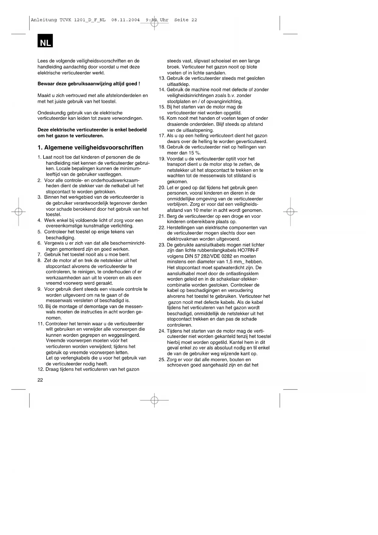 Anleitung TCVK 1201_D_F_NL 08.11.2004 9:52 Uhr Seite 23wisselstroom). Er is echter slechts één veiligheidsstopcontact toegestaan die door een kabelveiligheidsschakelaar voor 16A moet worden beveiligd. Bovendien moet een 30 mA verliesstroom- veiligheidsschakelaar voorhanden zijn ! Aansluitkabel van het toestel Gebruik voor het toestel enkel intacte aansluitkabels. De aansluitkabel van het toestel mag niet naar welbelieven lang zijn (max. 50m), omdat anders het vermogen van de elektrische motor vermindert. De aansluitkabel van het toestel moet een doorsnede van 3 x 1,5 mm2 hebben. Op aansluitkabels van verticuteerders doen zich bijzonder vaak beschadigingen van de isolatie voor. Oorzaken daarvoor zijn o.a. : - scheuren door overrijden van de kabel - platdrukken van de kabel wanneer de aansluitkabel van het toestel onder deuren en ramen wordt geleid - scheuren door veroudering van de isolatie - knikplaatsen door onoordeelkundig vastmaken of leiden van de aansluitkabel Dergelijke defecte aansluitkabels worden gebruikt ofschoon ze levensgevaarlijk zijn op grond van de beschadigde isolatie. Kabels, stekkers en stopcontacten moeten voldoen aan de hieronder vermelde eisen. Aansluitkabels van verticuteerders moeten voorzien zijn van een rubberisolatie. De aansluitkabel van het toestel moet minstens van het type H05RN-F en drieaderig zijn. De benaming van het type moet op de aansluitkabel van het toestel gedrukt zijn. Koop enkel gekenmerkte aansluitkabels ! Stekkers en stopcontacten van aansluitkabels moeten van rubber zijn en spatwaterdicht zijn. De aansluitkabels mogen niet willekeurig lang zijn. Voor vrij lange aansluitkabels zijn geleiders met een grotere doorsnede vereist. Aansluitkabels en verbindingskabels moeten regelmatig op schade worden gecontroleerd. Let er op dat de kabels tijdens de controle stroomloos zijn. Wind de aansluitkabel van het toestel helemaal af. Controleer ook de invoeringen van de aansluitkabel, op stekkers en stopcontacten, op knikplaatsen. De verticuteerder is geschikt voor particulier gebruik in de huis- en hobbytuin. Als verticuteerders voor de particuliere huis- en hobbytuin worden diegene beschouwd die doorgaans niet langer dan 10 uur jaarlijks overwegend worden gebruikt voor het verzorgen van gras- en gazonvlakten, maar niet in openbare plantsoenen, sportpleinen en ook niet in de land- en bosbouw. Het behoorlijk gebruik van de verticuteerder houdt in dat de bijgaande gebruiksaanwijzing van de fabrikant in acht wordt genomen. De gebruiksaanwijzing bevat ook de bedrijfsomstandigheden en onderhoudsvoorwaarden. Let op ! Teneinde de gebruiker niet bloot te stellen aan het gevaar voor lichamelijk letsel, mag de verticuteerder niet gebruikt worden als hakselaar voor het klein snijden van snoeisels van takken of heggen. De verticuteerder mag evenmin worden gebruikt als motorhakfrees en ook niet voor het gelijkmaken van bodemverheffingen, zoals b.v. molshopen. Om veiligheidsredenen mag de verticuteerder niet worden gebruikt als aandrijfaggregaat voor andere werkgereedschappen en gereedschapssets van welke aard dan ook.