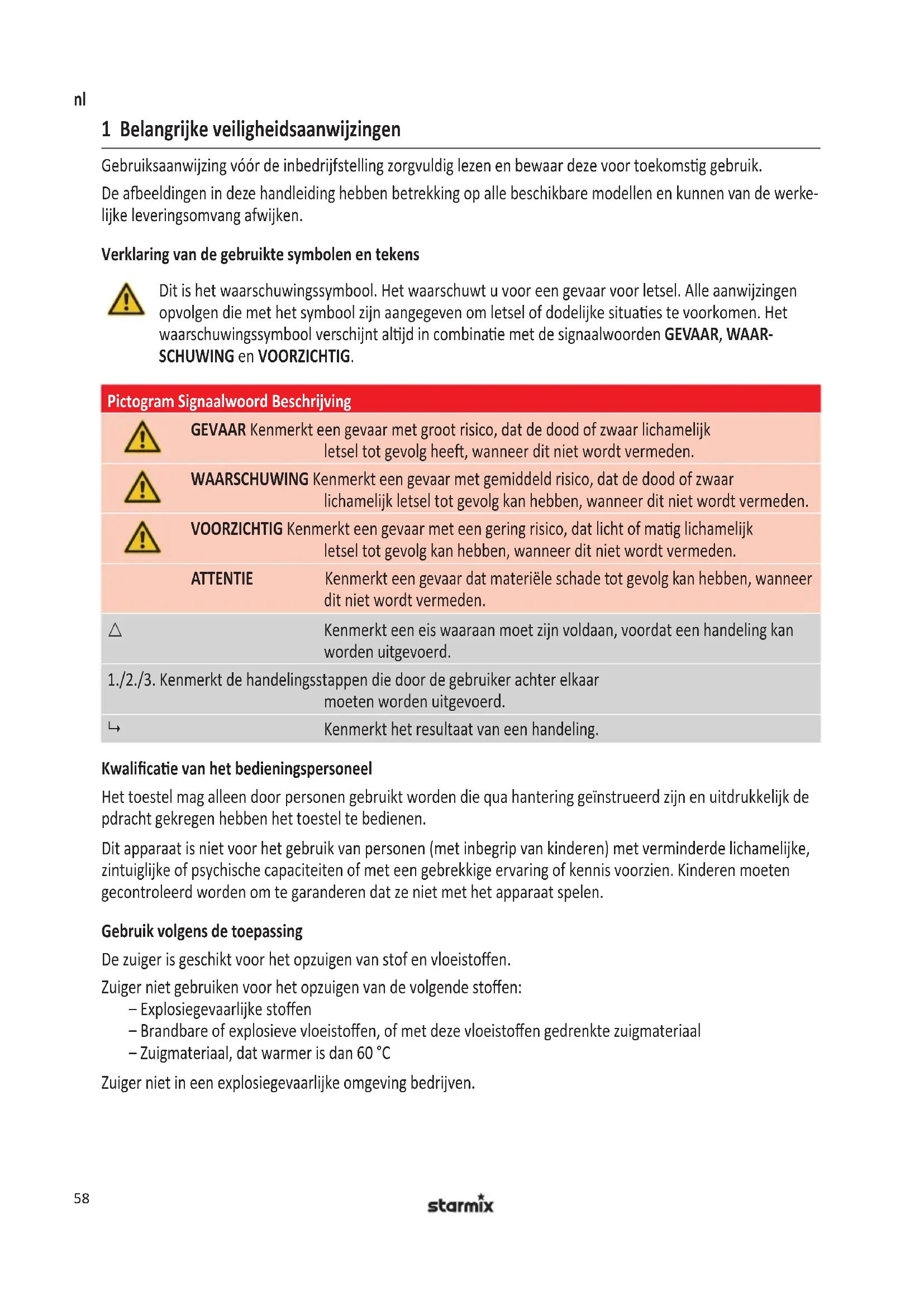 Zuigers die nicht beschikken over een identificatie van de stofklasse L, zich alleen geschikt voor op-/wegzuigen van ongevaarlijke stoffen.