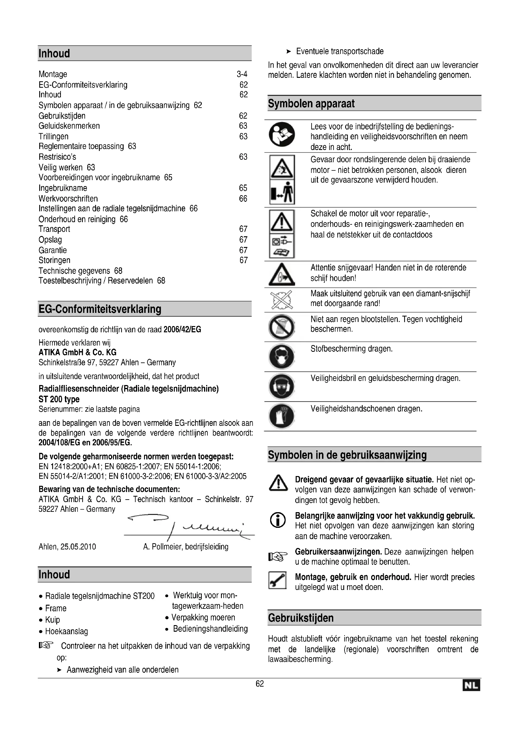 Inhoud Montage 3-4 EG-Conformiteitsverklaring 62 Inhoud 62 Symbolen apparaat / in de gebruiksaanwijzing 62 Gebruikstijden 62 Geluidskenmerken 63 Trillingen 63 Reglementaire toepassing 63 Restrisico’s 63 Veilig werken 63 Voorbereidingen voor ingebruikname 65 Ingebruikname 65 Werkvoorschriften 66 Instellingen aan de radiale tegelsnijdmachine 66 Onderhoud en reiniging 66 Transport 67 Opslag 67 Garantie 67 Storingen 67 Technische gegevens 68 Toestelbeschrijving / Reservedelen 68