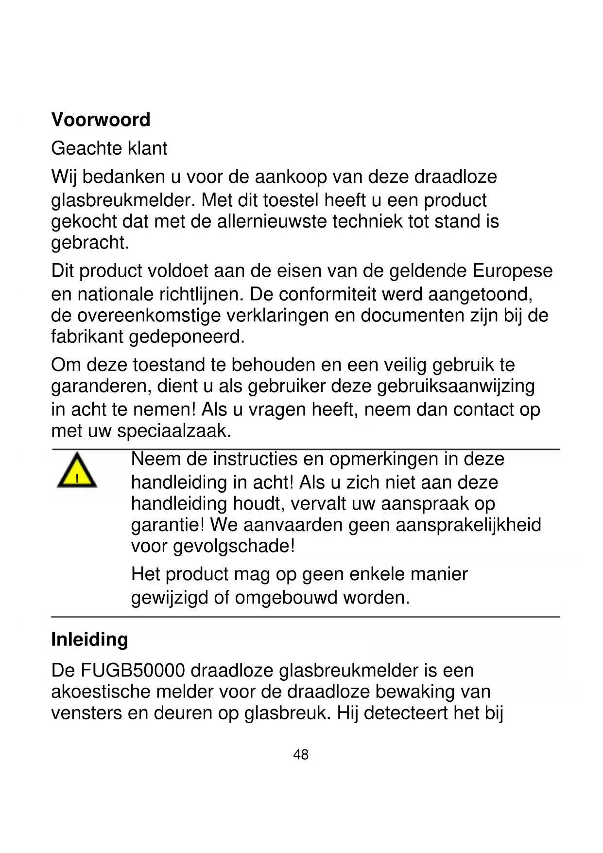 Wij bedanken u voor de aankoop van deze draadloze glasbreukmelder. Met dit toestel heeft u een product gekocht dat met de allernieuwste techniek tot stand is gebracht.