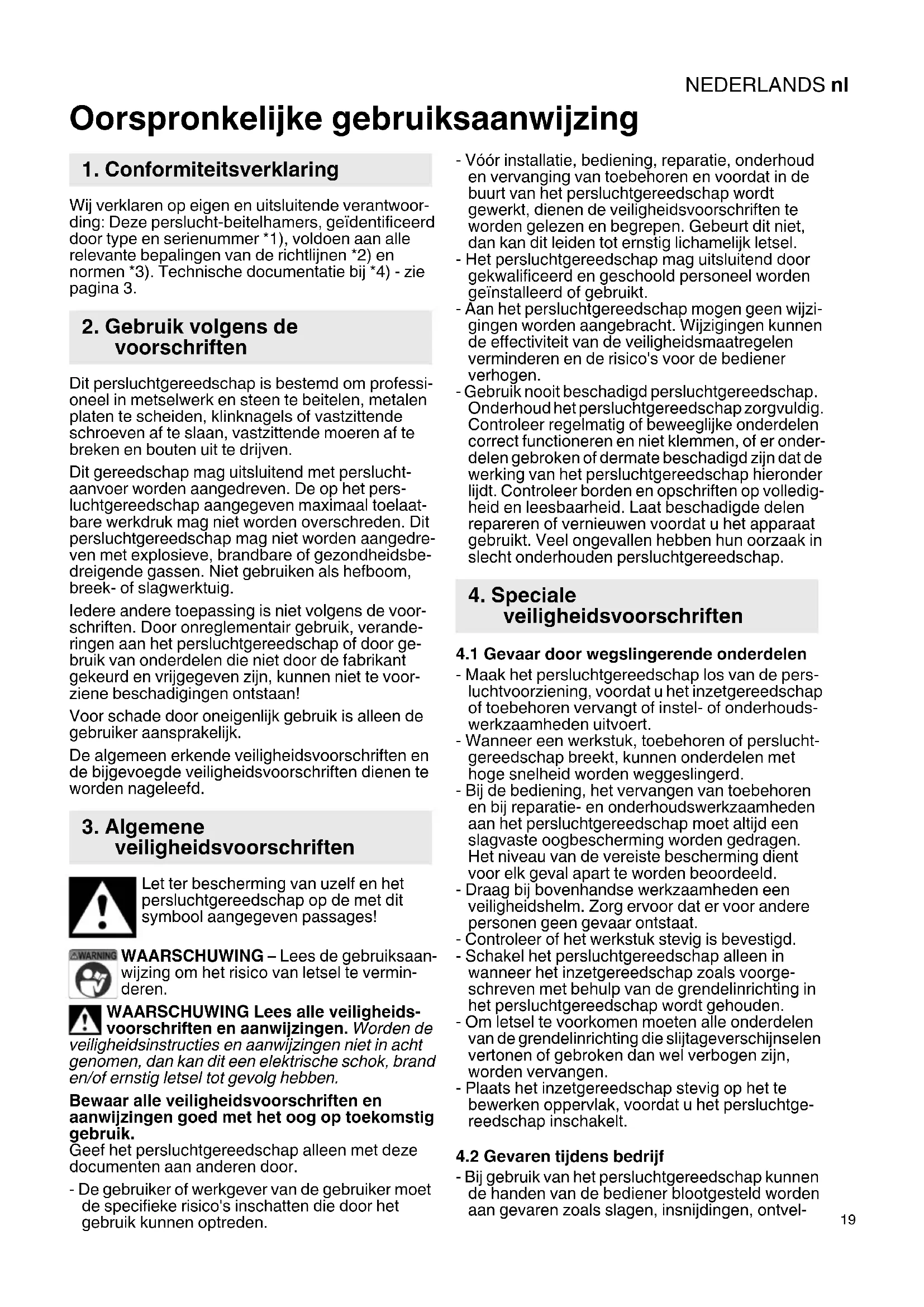 Oorspronkelijke gebruiksaanwijzing Wij verklaren op eigen en uitsluitende verantwoor- ding: Deze perslucht-beitelhamers, geïdentificeerd door type en serienummer *1), voldoen aan alle relevante bepalingen van de richtlijnen *2) en normen *3). Technische documentatie bij *4) - zie pagina 3. Dit persluchtgereedschap is bestemd om professi- oneel in metselwerk en steen te beitelen, metalen platen te scheiden, klinknagels of vastzittende schroeven af te slaan, vastzittende moeren af te breken en bouten uit te drijven. Dit gereedschap mag uitsluitend met perslucht- aanvoer worden aangedreven. De op het pers- luchtgereedschap aangegeven maximaal toelaat- bare werkdruk mag niet worden overschreden. Dit persluchtgereedschap mag niet worden aangedre- ven met explosieve, brandbare of gezondheidsbe- dreigende gassen. Niet gebruiken als hefboom, breek- of slagwerktuig. Iedere andere toepassing is niet volgens de voor- schriften. Door onreglementair gebruik, verande- ringen aan het persluchtgereedschap of door ge- bruik van onderdelen die niet door de fabrikant gekeurd en vrijgegeven zijn, kunnen niet te voor- ziene beschadigingen ontstaan! Voor schade door oneigenlijk gebruik is alleen de gebruiker aansprakelijk. De algemeen erkende veiligheidsvoorschriften en de bijgevoegde veiligheidsvoorschriften dienen te worden nageleefd. Let ter bescherming van uzelf en het persluchtgereedschap op de met dit symbool aangegeven passages! WAARSCHUWING – Lees de gebruiksaan- wijzing om het risico van letsel te vermin- deren. WAARSCHUWING Lees alle veiligheids- voorschriften en aanwijzingen. Worden de veiligheidsinstructies en aanwijzingen niet in acht genomen, dan kan dit een elektrische schok, brand en/of ernstig letsel tot gevolg hebben. Bewaar alle veiligheidsvoorschriften en aanwijzingen goed met het oog op toekomstig gebruik. Geef het persluchtgereedschap alleen met deze documenten aan anderen door. - De gebruiker of werkgever van de gebruiker moet de specifieke risico's inschatten die door het gebruik kunnen optreden. - Vóór installatie, bediening, reparatie, onderhoud en vervanging van toebehoren en voordat in de buurt van het persluchtgereedschap wordt gewerkt, dienen de veiligheidsvoorschriften te worden gelezen en begrepen. Gebeurt dit niet, dan kan dit leiden tot ernstig lichamelijk letsel. - Het persluchtgereedschap mag uitsluitend door gekwalificeerd en geschoold personeel worden geïnstalleerd of gebruikt. - Aan het persluchtgereedschap mogen geen wijzi- gingen worden aangebracht. Wijzigingen kunnen de effectiviteit van de veiligheidsmaatregelen verminderen en de risico's voor de bediener verhogen. - Gebruik nooit beschadigd persluchtgereedschap. Onderhoud het persluchtgereedschap zorgvuldig. Controleer regelmatig of beweeglijke onderdelen correct functioneren en niet klemmen, of er onder- delen gebroken of dermate beschadigd zijn dat de werking van het persluchtgereedschap hieronder lijdt. Controleer borden en opschriften op volledig- heid en leesbaarheid. Laat beschadigde delen repareren of vernieuwen voordat u het apparaat gebruikt. Veel ongevallen hebben hun oorzaak in slecht onderhouden persluchtgereedschap.