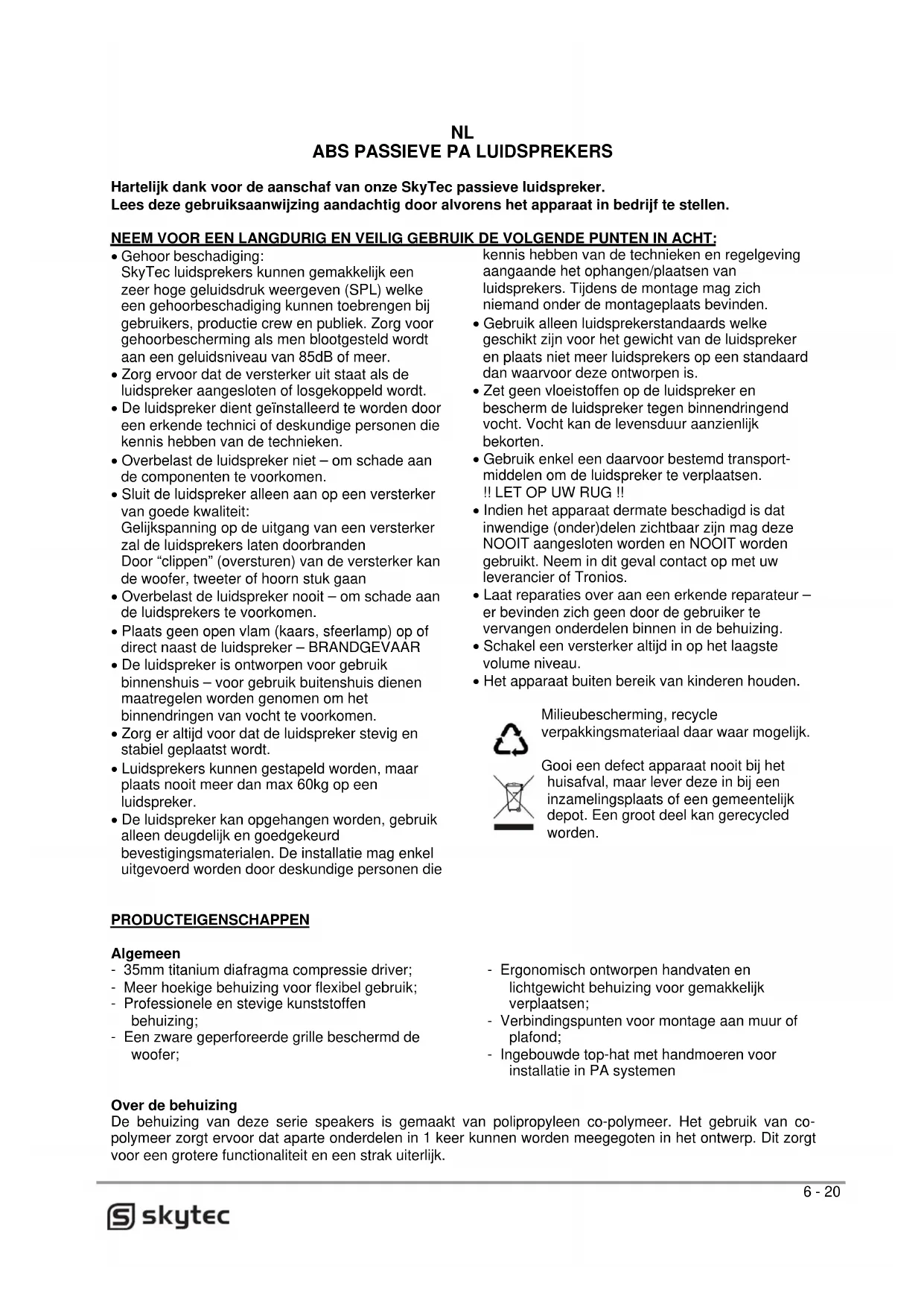 - Gehoor beschadiging: SkyTec luidsprekers können gemakkelijk een zeer hoge geluidsdruk weergeven (SPL) welke een gehoorbeschadiging kennen toebrengen bij gebruikers, productie crew en publiek. Zorg voor gehoorbescherming als men blootgesteld worden aan een geluidsniveau van 85dB ofeer.