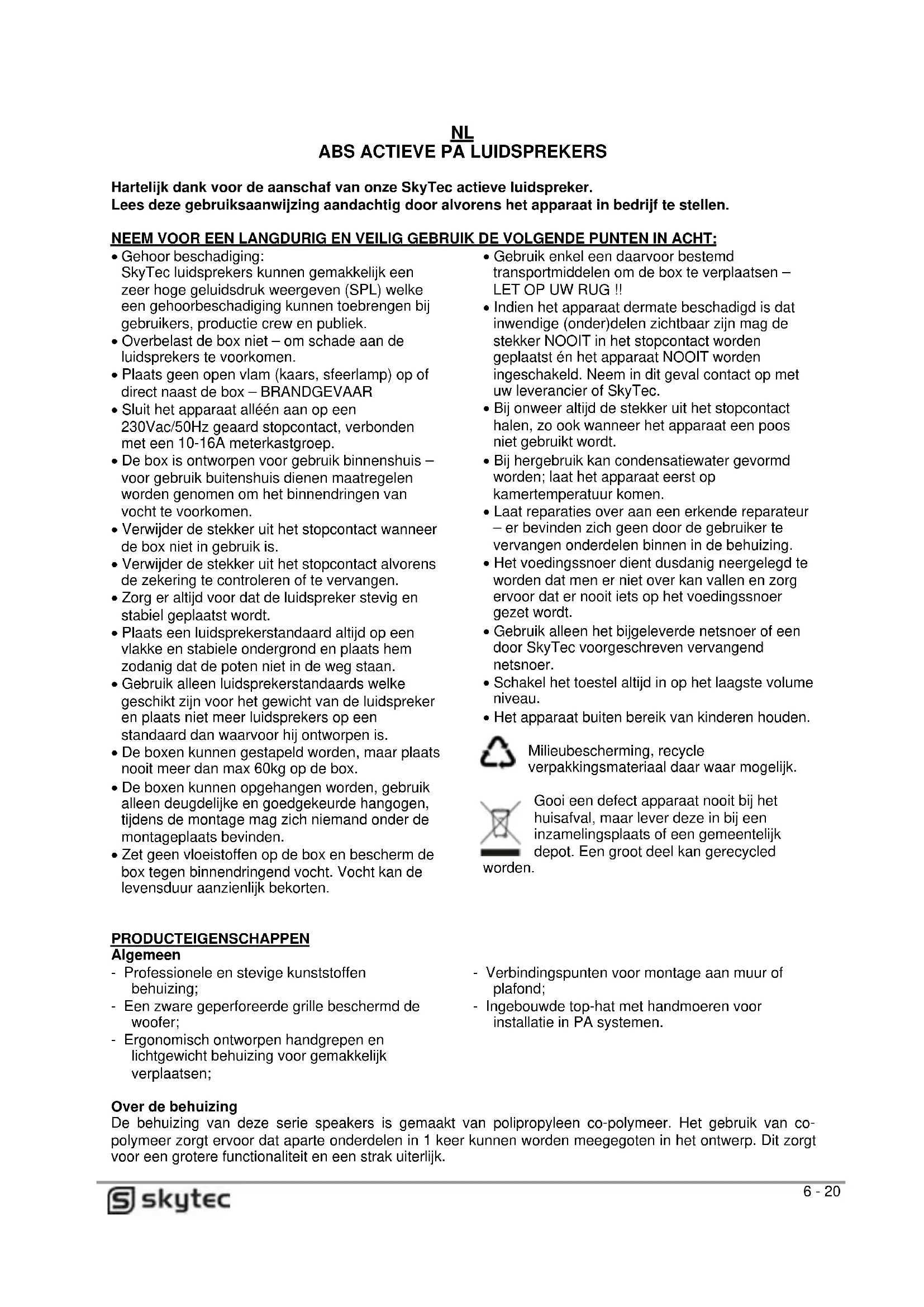 SkyTec luidsprekers kunnen gemakkelijk een zeer hoge geluidsdruk weergeven (SPL) welke een gehoorbeschadiging kunnen toebrengen bij gebruikers, productie crew en publiek.