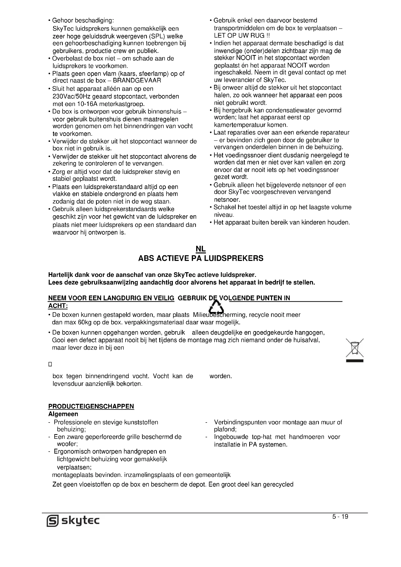 - Gehoor beschadiging: SkyTec luidsprekers können gemakkelijk een zeer hoge geluidsdruk weergeven (SPL) welke een gehoorbeschadiging können toebrengen bij gebruikers, productie crew en publiek.