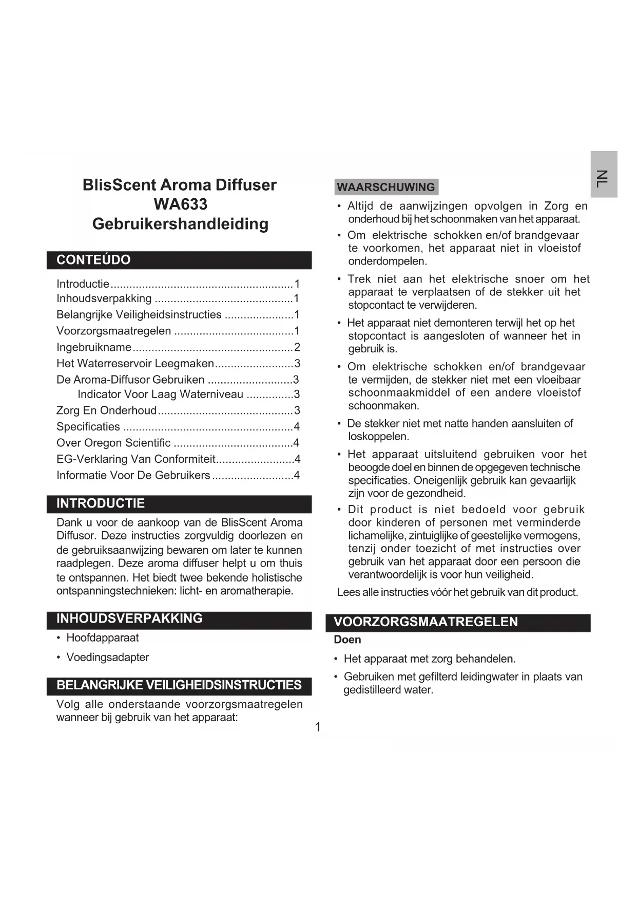 - Informatie Voor De Gebruikers INTRODUCTIE Dank u voor de aankoop van de BlisScent Aroma Diffusor. Deze instructies zorgvuldig doorlezen en de gebruiksaanwijzing bewaren om later te kunnen raadplegen. Deze aroma diffuser helpt u om thuis te ontspannen. Het biedt twee bekende holistische ontspanningstechnieken: licht- en aromatherapie. INHOUDSVERPAKKING p. 4