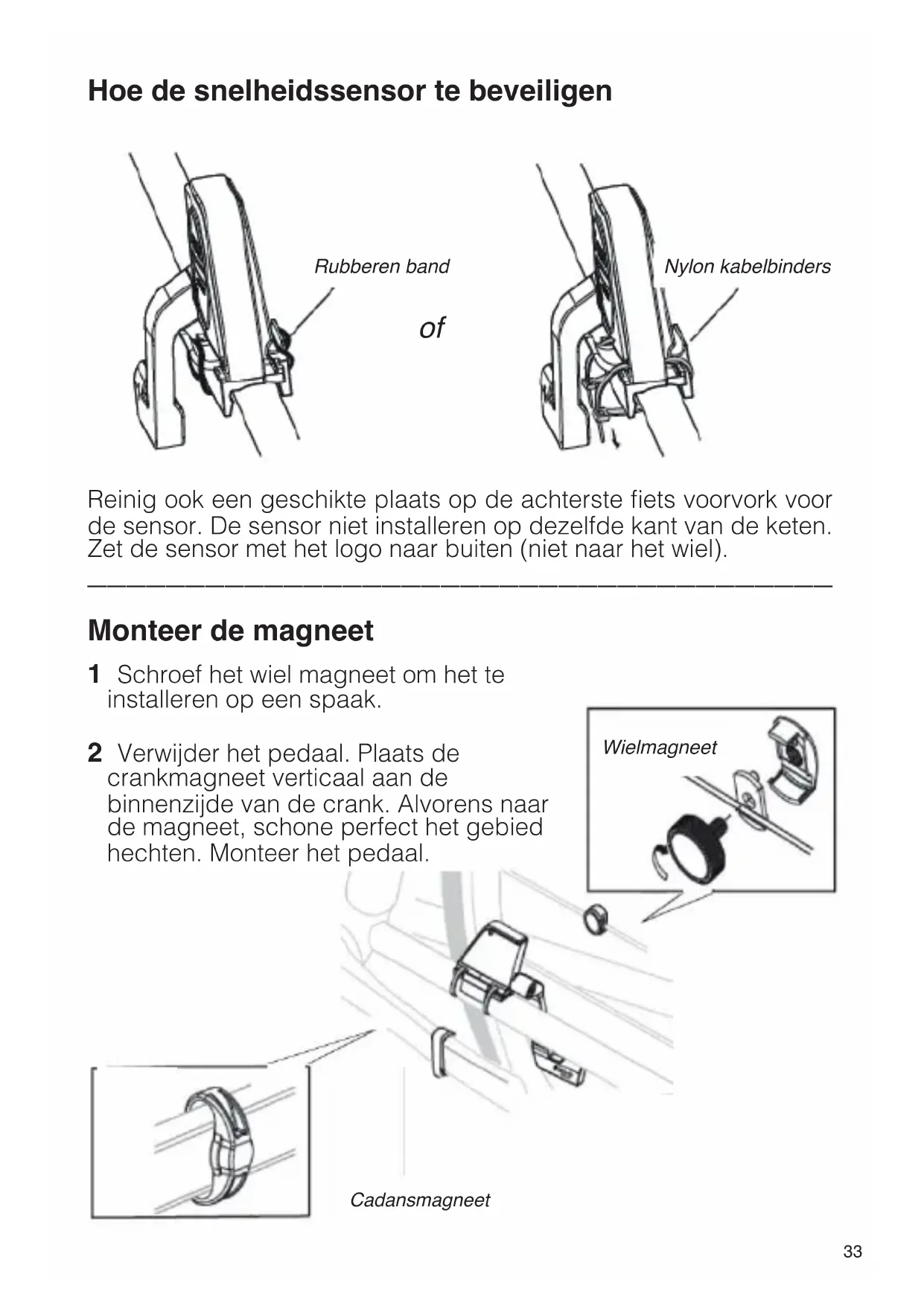Hoe te snelheidssensor en magneet monteren snelheidssensor Cadansmagneet Wielmagneet Schroevedraaier Nylon kabel Rubberen band Cadanssensor Snelheidssensor Wielmagneet Cadansmagneet33 Hoe de snelheidssensor te beveiligen Reinig ook een geschikte plaats op de achterste fi ets voorvork voor de sensor. De sensor niet installeren op dezelfde kant van de keten. Zet de sensor met het logo naar buiten (niet naar het wiel).