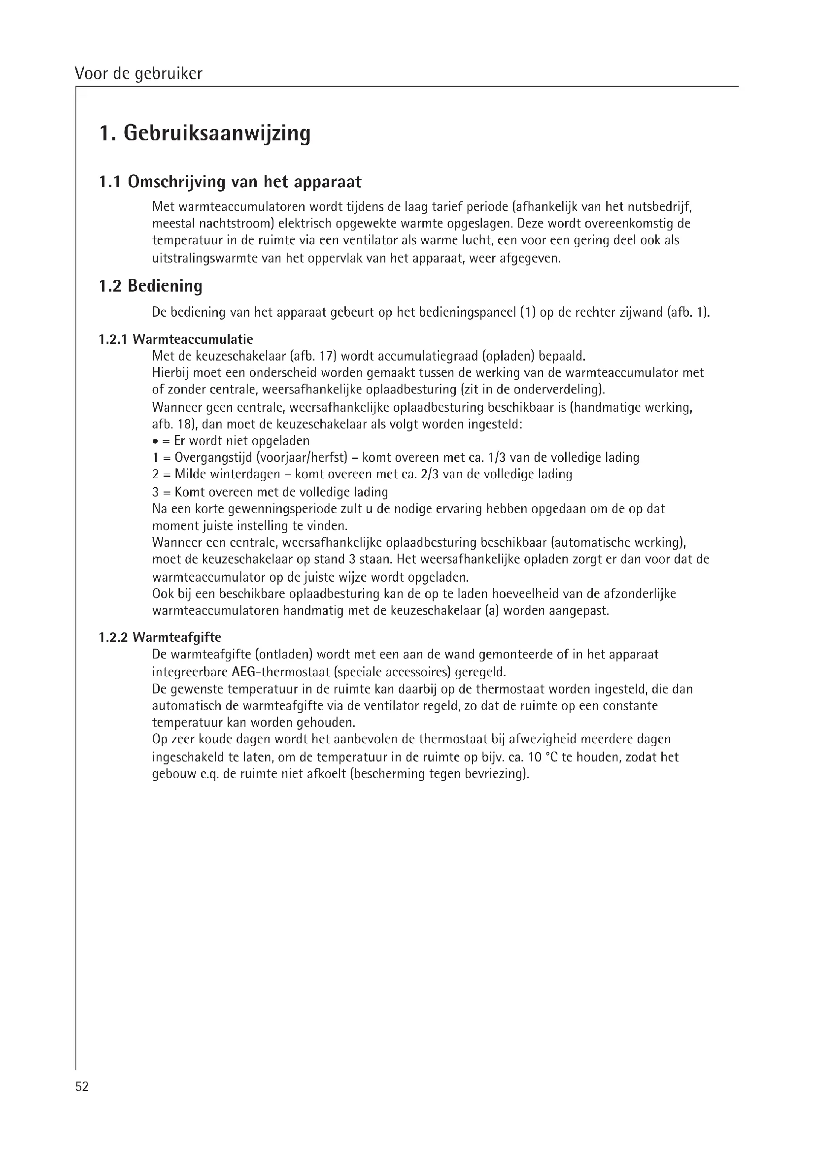 De warmteafgifte (ontladen) worden met een aan de wand gemonteerde of in het apparaat integreerbare AEG-thermostat (speciale accessoires) geregeld.