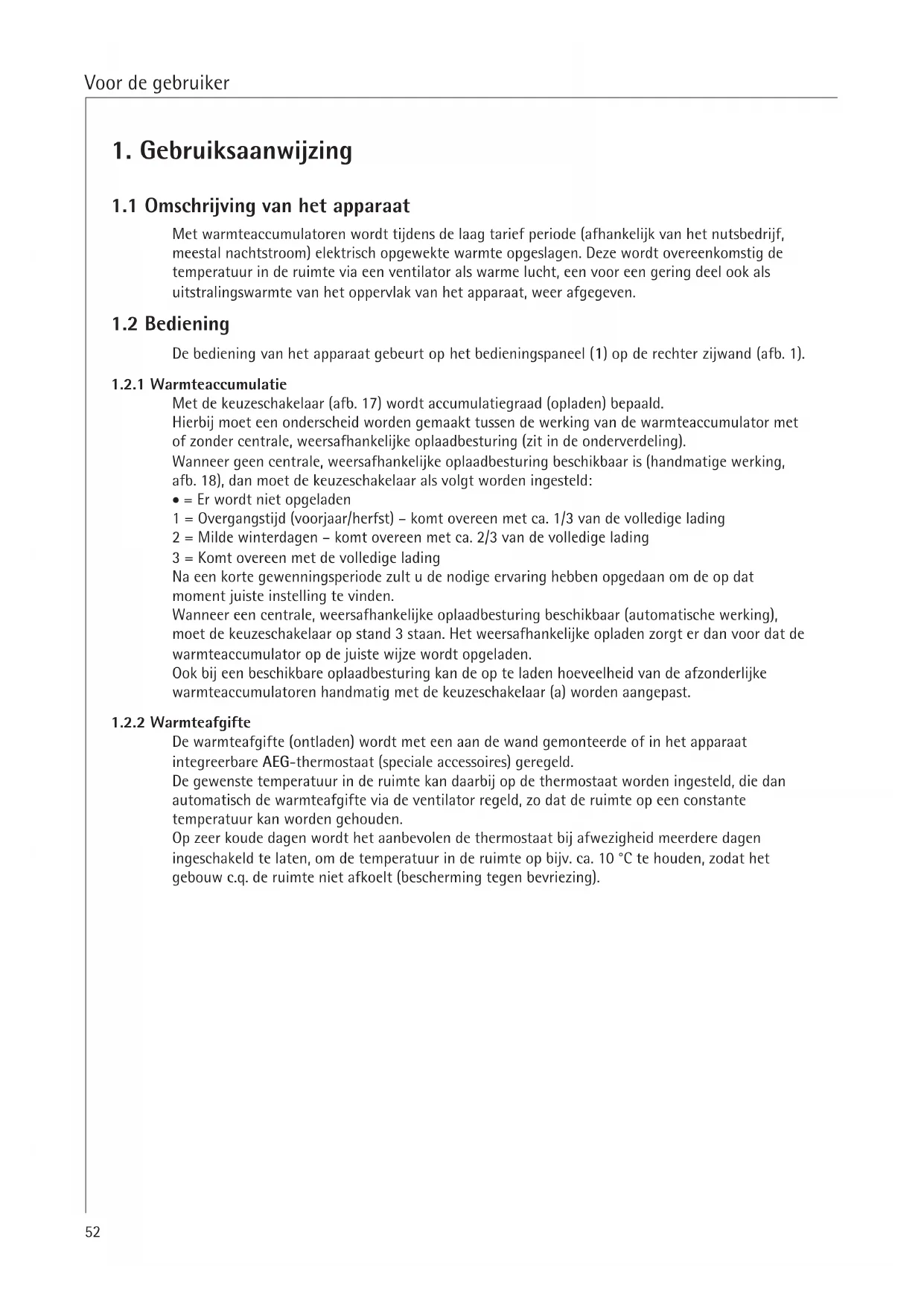 De warmteafgifte (ontladen) wordt met een aan de wand gemonteerde of in het apparaat integreerbare AEG-thermostaat (speciale accessoires) geregeld. De gewenste temperatuur in de ruimte kan daarbij op de thermostaat worden ingesteld, die dan automatisch de warmteafgifte via de ventilator regeld, zo dat de ruimte op een constante temperatuur kan worden gehouden. Op zeer koude dagen wordt het aanbevolen de thermostaat bij afwezigheid meerdere dagen ingeschakeld te laten, om de temperatuur in de ruimte op bijv. ca. 10 °C te houden, zodat het gebouw c.q. de ruimte niet afkoelt (bescherming tegen bevriezing). Voor de gebruiker53 Nederlands