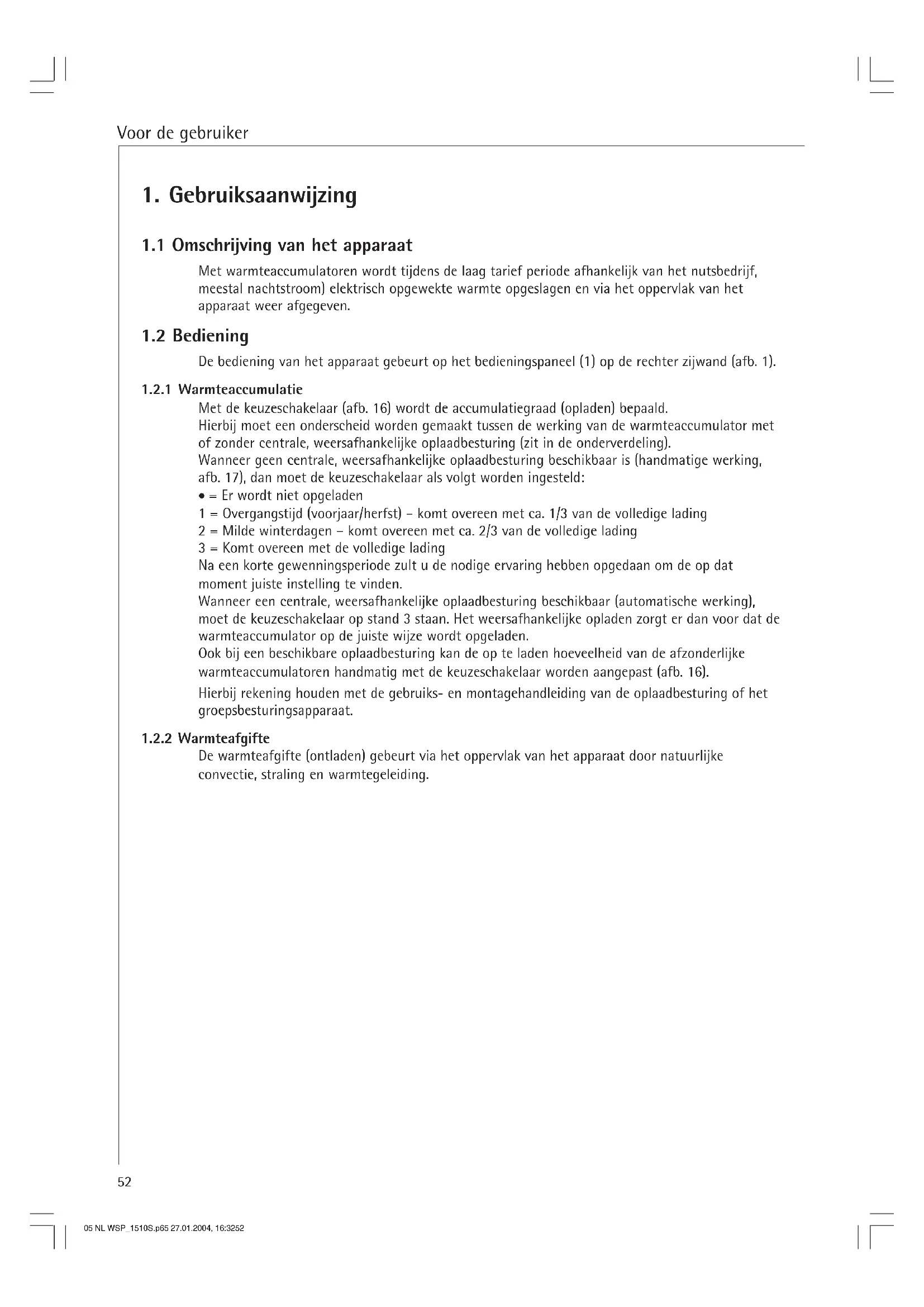 De accumulatorentenen worden middels de tussen de rijen accumulatorentenen liggende verwarmingselementen verwarmd. Met de oplaadregelaar (keuzeschakelaar afb. 16) wordt het opladen traploos ingesteld. Begin en duur van het opladen worden bepaald door de verantwoordelijke energieleverancier (nutsbedrijf) bepaald. Een ingebouwde veiligheidstemperatuurregelaar (17) alsmede een veiligheidstemperatuurbegrenzer (18) voorkomen dat het apparaat oververhit raakt. Terwijl de veiligheidsthermostaten automatisch opnieuw inschakelen, moet de veiligheidstemperatuurbegrenzer door de vakman, door het indrukken van de in het midden van de begrenzer aangebrachte knop, na het verhelpen van de storing opnieuw worden ingeschakeld. De aldus geaccumuleerde warmte wordt dan via het oppervlak van het apparaat door natuurlijke convectie, straling en warmtegeleiding afgegeven.