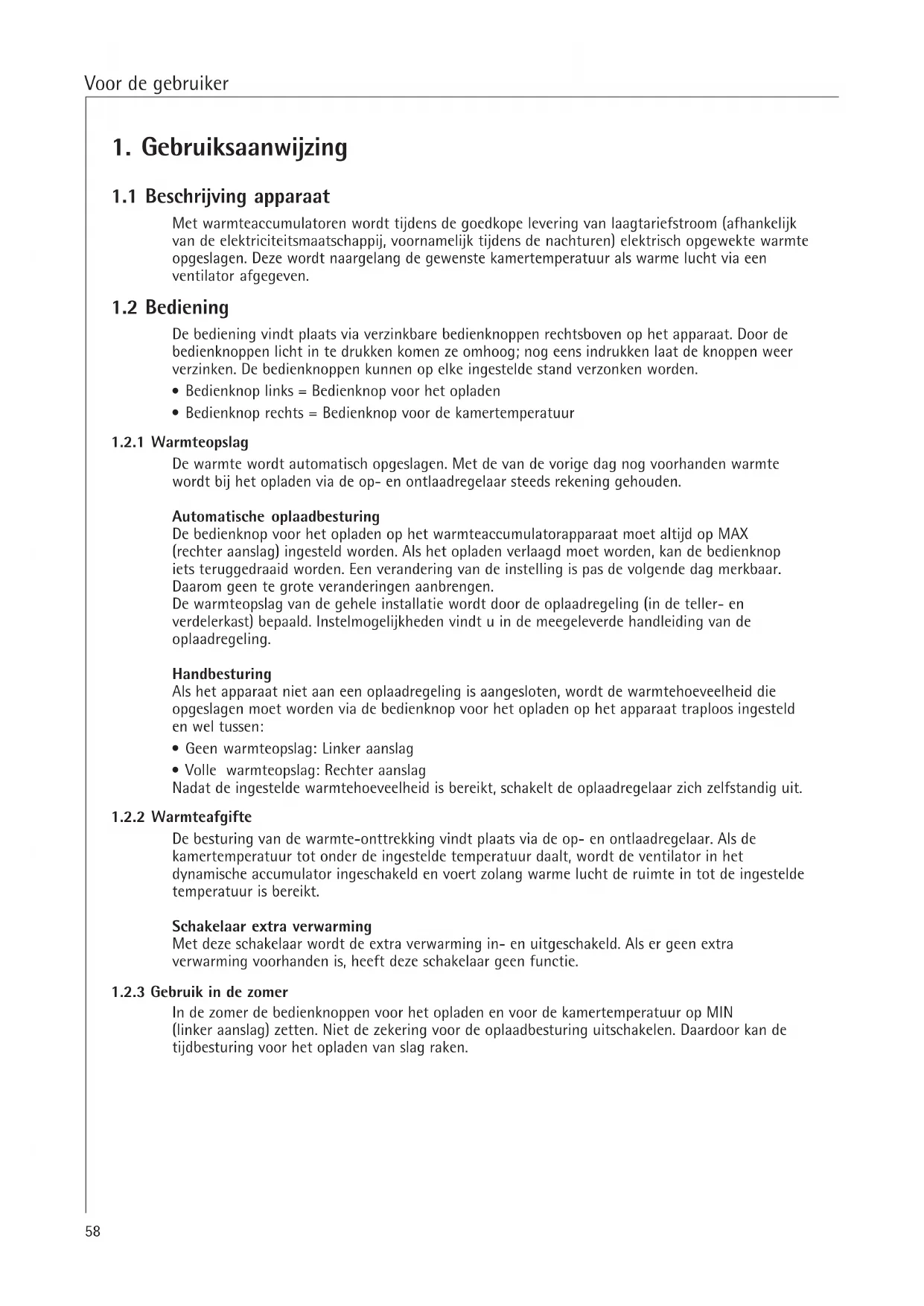 aan de gebruiker na de installatie overhandigd worden. Bovendien moet de gebruiker geïnstrueerd worden t.a.v. het functioneren van de elektrische accumulatorverwarming.