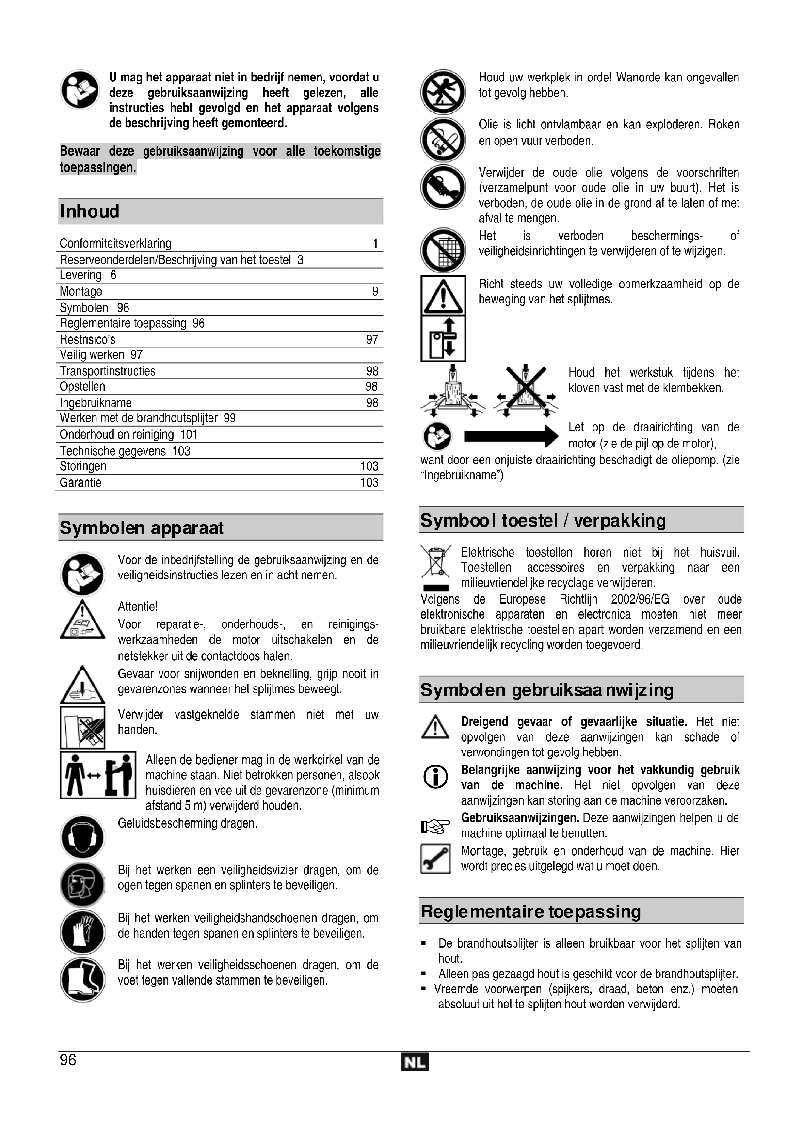 Conformiteitsverklaring 1 Reserveonderdelen/Beschrijving van het toestel 3 Levering 6 Montage 9 Symbolen 96 Reglementaire toepassing 96 Restrisico’s 97 Veilig werken 97 Transportinstructies 98 Opstellen 98 Ingebruikname 98 Werken met de brandhoutsplijter 99 Onderhoud en reiniging 101 Technische gegevens 103 Storingen 103 Garantie 103