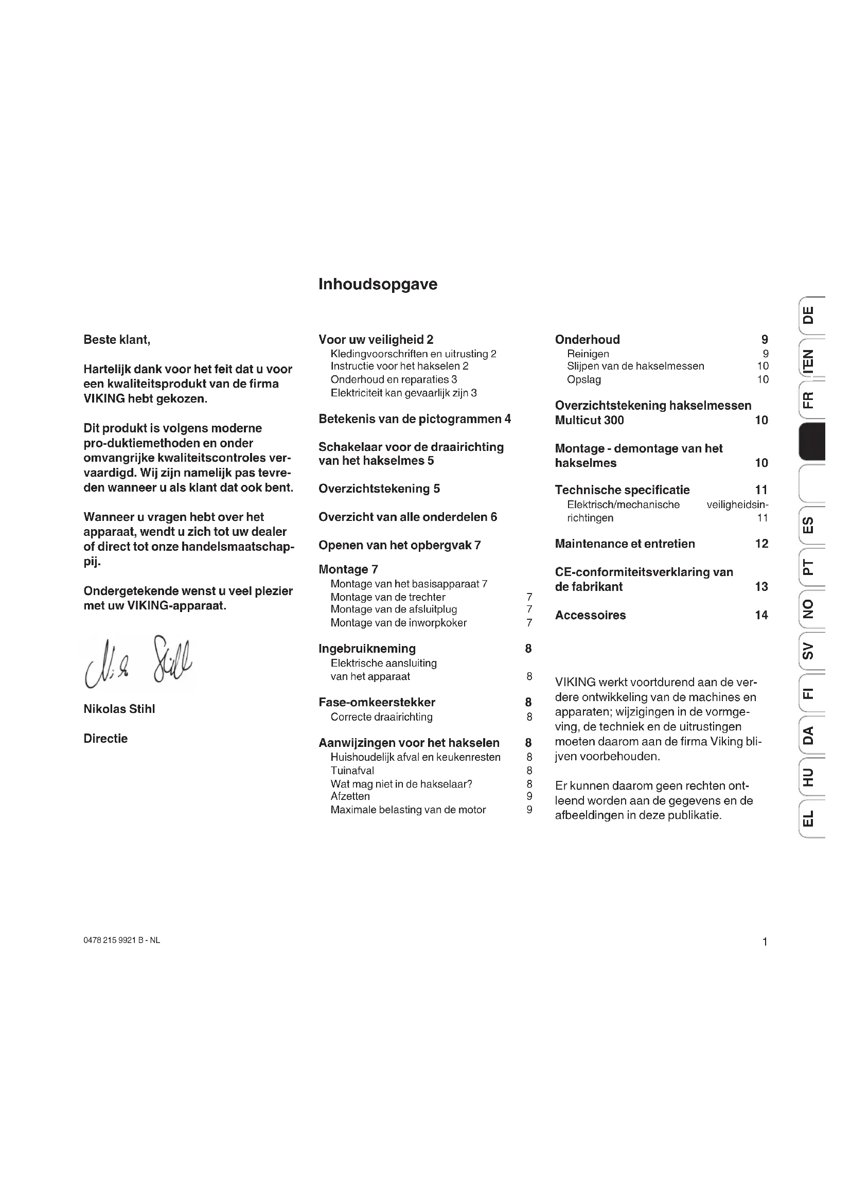 Beste klant, Hartelijk dank voor het feit dat u voor een kwaliteitsprodukt van de firma VIKING hebt gekozen. Dit produkt is volgens moderne pro-duktiemethoden en onder omvangrijke kwaliteitscontroles ver- vaardigd. Wij zijn namelijk pas tevre- den wanneer u als klant dat ook bent. Wanneer u vragen hebt over het apparaat, wendt u zich tot uw dealer of direct tot onze handelsmaatschap- pij. Ondergetekende wenst u veel plezier met uw VIKING-apparaat. Nikolas Stihl Directie Inhoudsopgave VIKING werkt voortdurend aan de ver- dere ontwikkeling van de machines en apparaten; wijzigingen in de vormge- ving, de techniek en de uitrustingen moeten daarom aan de firma Viking bli- jven voorbehouden. Er kunnen daarom geen rechten ont- leend worden aan de gegevens en de afbeeldingen in deze publikatie. Voor uw veiligheid 2 Kledingvoorschriften en uitrusting 2 Instructie voor het hakselen 2 Onderhoud en reparaties 3 Elektriciteit kan gevaarlijk zijn 3 Betekenis van de pictogrammen 4 Schakelaar voor de draairichting van het hakselmes 5 Overzichtstekening 5 Overzicht van alle onderdelen 6 Openen van het opbergvak 7 Montage 7 Montage van het basisapparaat 7 Montage van de trechter 7 Montage van de afsluitplug 7 Montage van de inworpkoker 7 Ingebruikneming 8 Elektrische aansluiting van het apparaat 8 Fase-omkeerstekker 8 Correcte draairichting 8 Aanwijzingen voor het hakselen 8 Huishoudelijk afval en keukenresten 8 Tuinafval 8 Wat mag niet in de hakselaar? 8 Afzetten 9 Maximale belasting van de motor 9 Onderhoud 9 Reinigen 9 Slijpen van de hakselmessen 10 Opslag 10 Overzichtstekening hakselmessen Multicut 300 10 Montage - demontage van het hakselmes 10 Technische specificatie 11 Elektrisch/mechanische veiligheidsin- richtingen 11 Maintenance et entretien 12 CE-conformiteitsverklaring van de fabrikant 13 Accessoires 140478 215 9921 B - NL