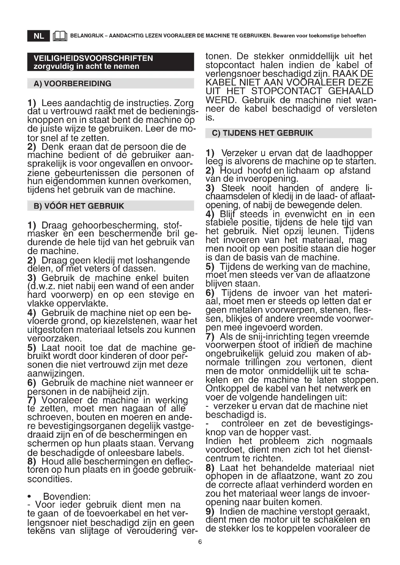 BELANGRIJK – AANDACHTIG LEZEN VOORALEER DE MACHINE TE GEBRUIKEN. Bewaren voor toekomstige behoeften VEILIGHEIDSVOORSCHRIFTEN zorgvuldig in acht te nemen A) VOORBEREIDING