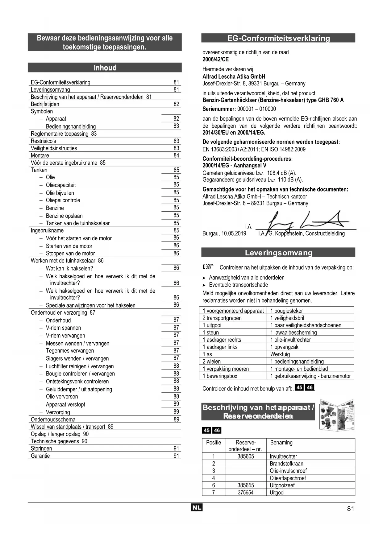 overeenkomstig de richtlijn van de raad 2006/42/CE Hiermede verklaren wij Altrad Lescha Atika GmbH Josef-Drexler-Str. 8, 89331 Burgau – Germany in uitsluitende verantwoordelijkheid, dat het product Benzin-Gartenhäcklser (Benzine-hakselaar) type GHB 760 A Serienummer: 000001 – 010000 aan de bepalingen van de boven vermelde EG-richtlijnen alsook aan de bepalingen van de volgende verdere richtlijnen beantwoordt: 2014/30/EU en 2000/14/EG. De volgende geharmoniseerde normen werden toegepast: