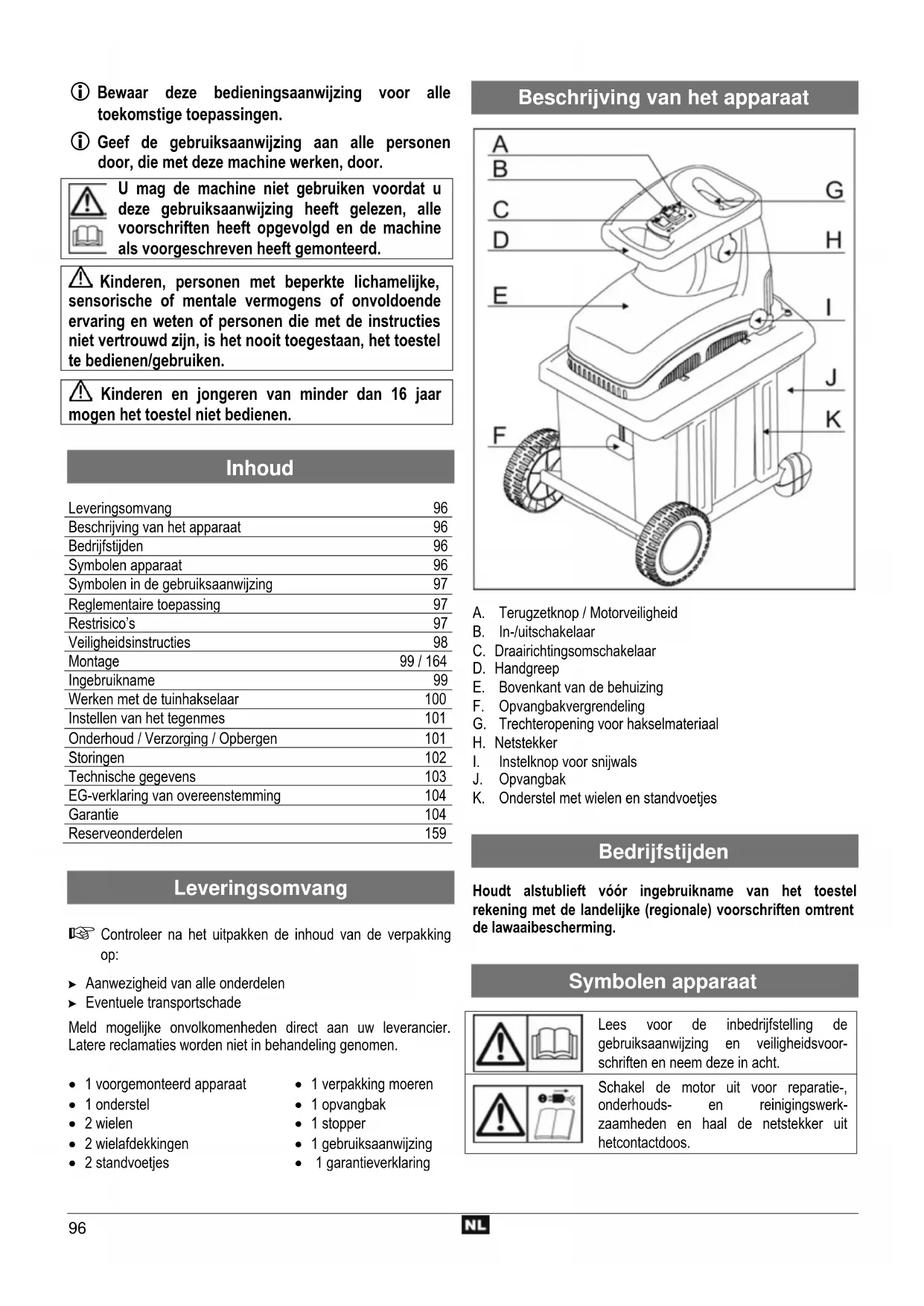Garantibetingelser Vennligst ta hensyn til den vedlagte garantierklæringen.96 Bewaar deze bedieningsaanwijzing voor alle toekomstige toepassingen. Geef de gebruiksaanwijzing aan alle personen door, die met deze machine werken, door. U mag de machine niet gebruiken voordat u deze gebruiksaanwijzing heeft gelezen, alle voorschriften heeft opgevolgd en de machine als voorgeschreven heeft gemonteerd.