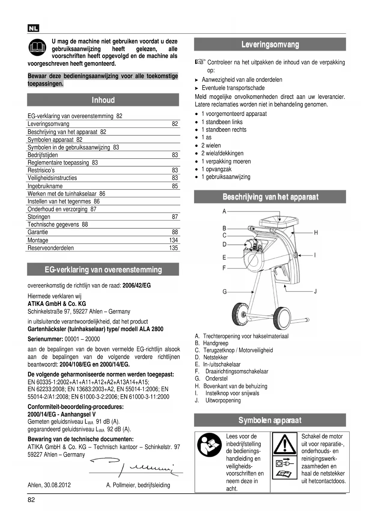 overeenkomstig de richtlijn van de raad: 2006/42/EG Hiermede verklaren wij ATIKA GmbH & Co. KG Schinkelstraße 97, 59227 Ahlen – Germany in uitsluitende verantwoordelijkheid, dat het product Gartenhäcksler (tuinhakselaar) type/ modell ALA 2800 Serienummer: 00001 – 20000 aan de bepalingen van de boven vermelde EG-richtlijn alsook aan de bepalingen van de volgende verdere richtlijnen beantwoordt: 2004/108/EG en 2000/14/EG. De volgende geharmoniseerde normen werden toegepast: EN 60335-1:2002+A1+A11+A12+A2+A13A14+A15; EN 62233:2008; EN 13683:2003+A2, EN 55014-1:2006; EN 55014-2/A1:2008; EN 61000-3-2:2006; EN 61000-3-11:2000 Conformiteit-beoordeling-procedures: 2000/14/EG - Aanhangsel V Gemeten geluidsniveau L