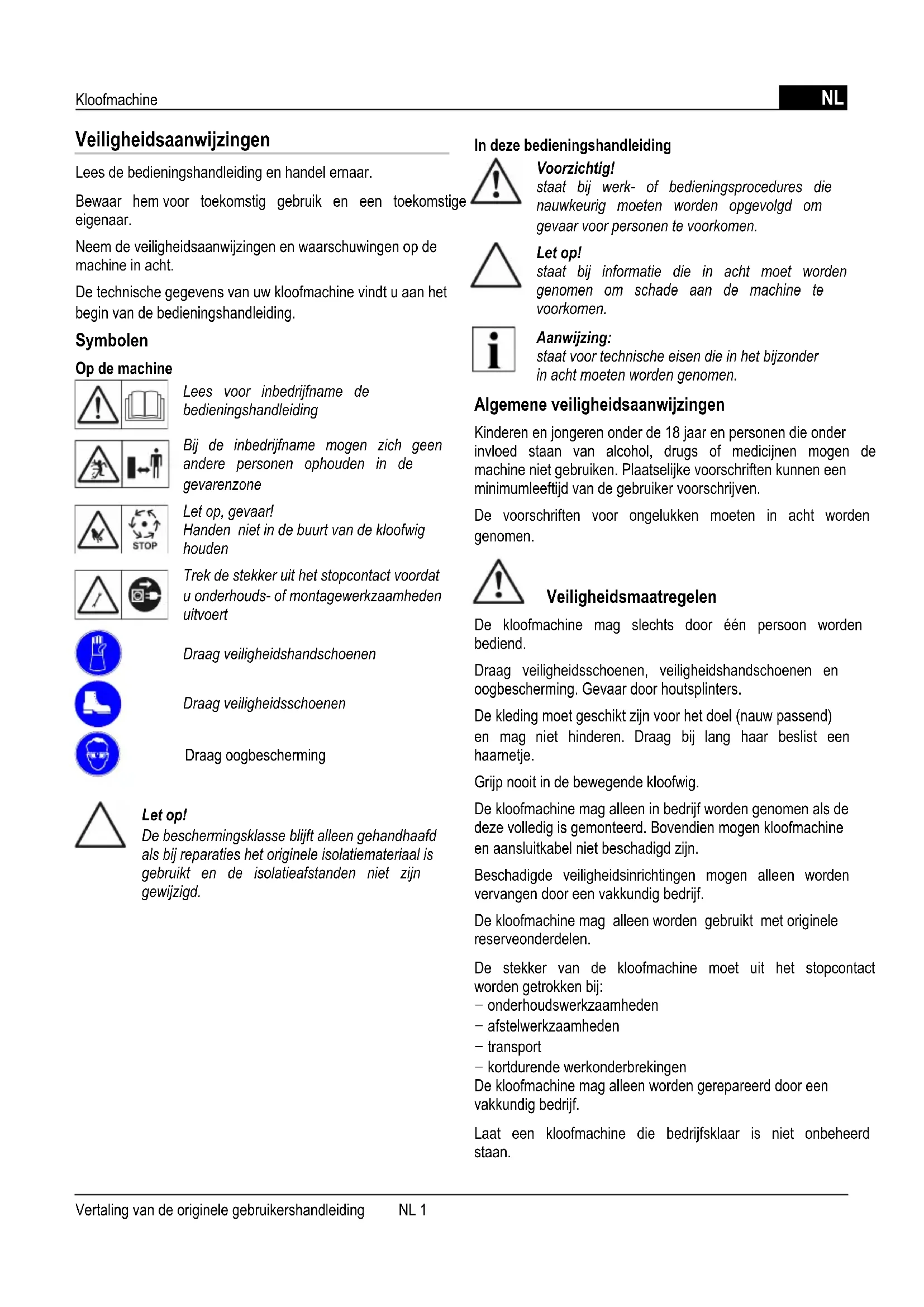 Veiligheidsaanwijzingen Lees de bedieningshandleiding en handel ernaar. Bewaar hem voor toekomstig gebruik en een toekomstige eigenaar. Neem de veiligheidsaanwijzingen en waarschuwingen op de machine in acht. De technische gegevens van uw kloofmachine vindt u aan het begin van de bedieningshandleiding. Symbolen Op de machine Lees voor inbedrijfname de bedieningshandleiding Bij de inbedrijfname mogen zich geen andere personen ophouden in de gevarenzone Let op, gevaar! Handen niet in de buurt van de kloofwig houden Trek de stekker uit het stopcontact voordat u onderhouds- of montagewerkzaamheden uitvoert Draag veiligheidshandschoenen Draag veiligheidsschoenen Draag oogbescherming Let op! De beschermingsklasse blijft alleen gehandhaafd als bij reparaties het originele isolatiemateriaal is gebruikt en de isolatieafstanden niet zijn gewijzigd. In deze bedieningshandleiding Voorzichtig! staat bij werk- of bedieningsprocedures die nauwkeurig moeten worden opgevolgd om gevaar voor personen te voorkomen. Let op! staat bij informatie die in acht moet worden genomen om schade aan de machine te voorkomen. Aanwijzing: staat voor technische eisen die in het bijzonder in acht moeten worden genomen. Algemene veiligheidsaanwijzingen Kinderen en jongeren onder de 18 jaar en personen die onder invloed staan van alcohol, drugs of medicijnen mogen de machine niet gebruiken. Plaatselijke voorschriften kunnen een minimumleeftijd van de gebruiker voorschrijven. De voorschriften voor ongelukken moeten in acht worden genomen. Veiligheidsmaatregelen De kloofmachine mag slechts door één persoon worden bediend. Draag veiligheidsschoenen, veiligheidshandschoenen en oogbescherming. Gevaar door houtsplinters. De kleding moet geschikt zijn voor het doel (nauw passend) en mag niet hinderen. Draag bij lang haar beslist een haarnetje. Grijp nooit in de bewegende kloofwig. De kloofmachine mag alleen in bedrijf worden genomen als de deze volledig is gemonteerd. Bovendien mogen kloofmachine en aansluitkabel niet beschadigd zijn. Beschadigde veiligheidsinrichtingen mogen alleen worden vervangen door een vakkundig bedrijf. De kloofmachine mag alleen worden gebruikt met originele reserveonderdelen. De stekker van de kloofmachine moet uit het stopcontact worden getrokken bij: − onderhoudswerkzaamheden − afstelwerkzaamheden − transport − kortdurende werkonderbrekingen De kloofmachine mag alleen worden gerepareerd door een vakkundig bedrijf. Laat een kloofmachine die bedrijfsklaar is niet onbeheerd staan. Vertaling van de originele gebruikershandleiding NL 1NL Kloofmachine Kloofmachine niet in bedrijf nemen als er mensen in de buurt zijn die niet bij het werk zijn betrokken. Gebruik de kloofmachine niet bij regen, laat hem niet in de regen staan of spuit hem niet af met water. Gevaar door elektriciteit. In het werkbereik van de kloofmachine mogen zich geen andere personen ophouden. Let op kinderen en dieren. De gebruiker van de machine is verantwoordelijk voor ongelukken met andere personen of hun eigendommen. Zorg dat het werkbereik vrij is van stukken hout en andere voorwerpen - struikelgevaar. Veiligheidsinrichtingen Motorbeveiligingsschakelaar De motorbeveiligingsschakelaar schakelt de motor bij overbelasting uit. De motorbeveiligingsschakelaar mag niet buiten werking worden gezet. Handel als volgt als de motorbeveiligingsschakelaar de kloofmachine heeft uitgeschakeld: