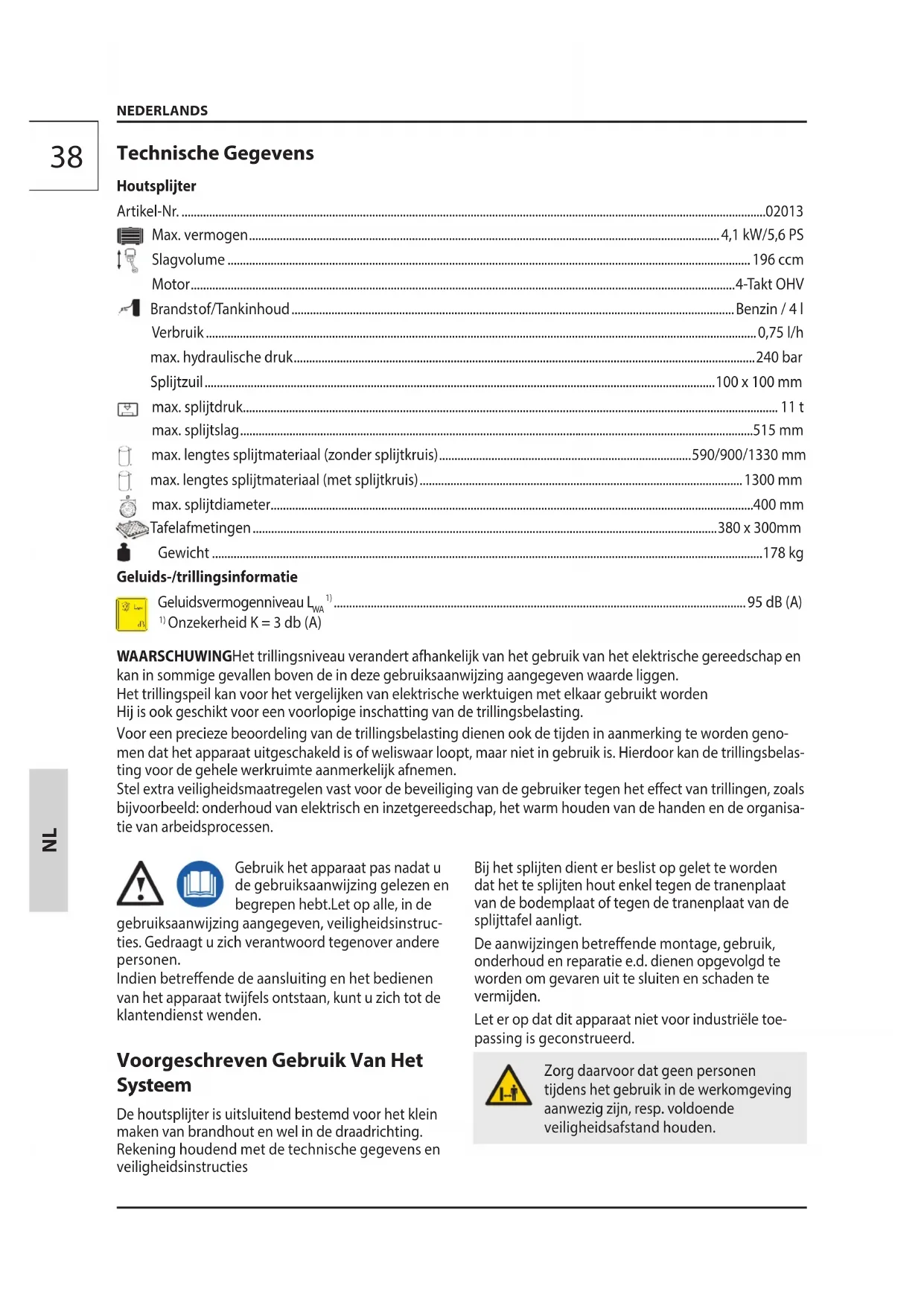 De houtsplijter is uitsluitend voor het bedienen door 1 persoon geconstrueerd. Aan de machine mogen nooit twee of meerdere personen werken.