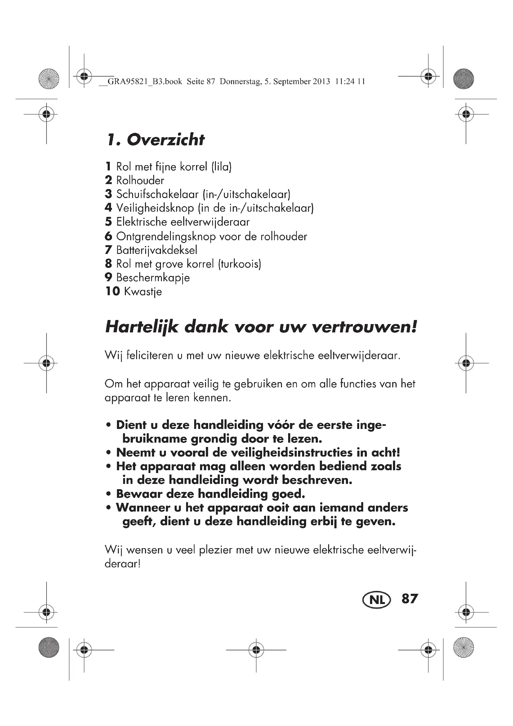 - Wanneer u het apparaat ooit aan iemand anders geeft, dient u deze handleiding erbij te geven. Wij wensen u veel plezier met uw nieuwe elektrische eeltverwij- deraar! __GRA95821_B3.book Seite 87 Donnerstag, 5. September 2013 11:24 1188
