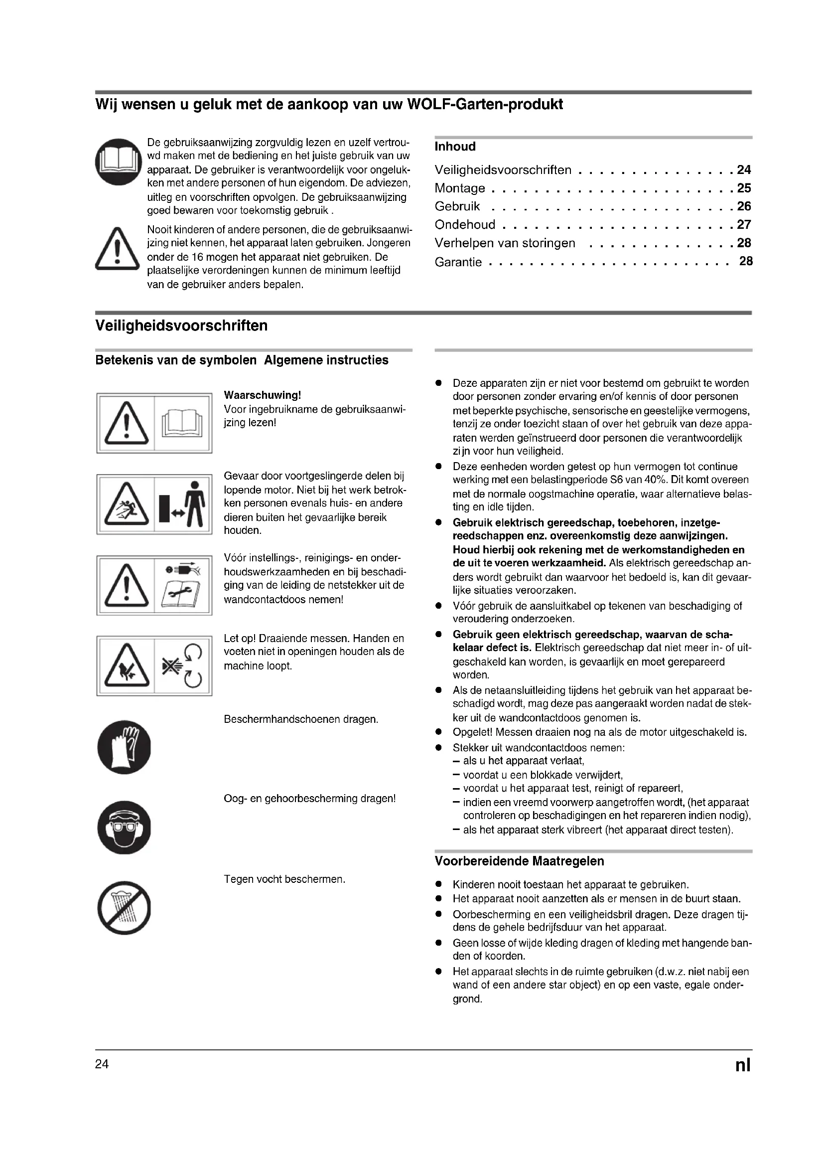 Vór alle onderhouds- en reinigingswerkzaamheden de netstekker uit de wandcontactdoos halen! Bij onderhoud aan de draaiende messen opletten dat deze nog konnen draaien als de motor al uitgeschakeld is. Uit veiligheidsoverwegingen het verrangen van de messen algtdoor een vakhbekwame werkplaats lately uittvoeren.